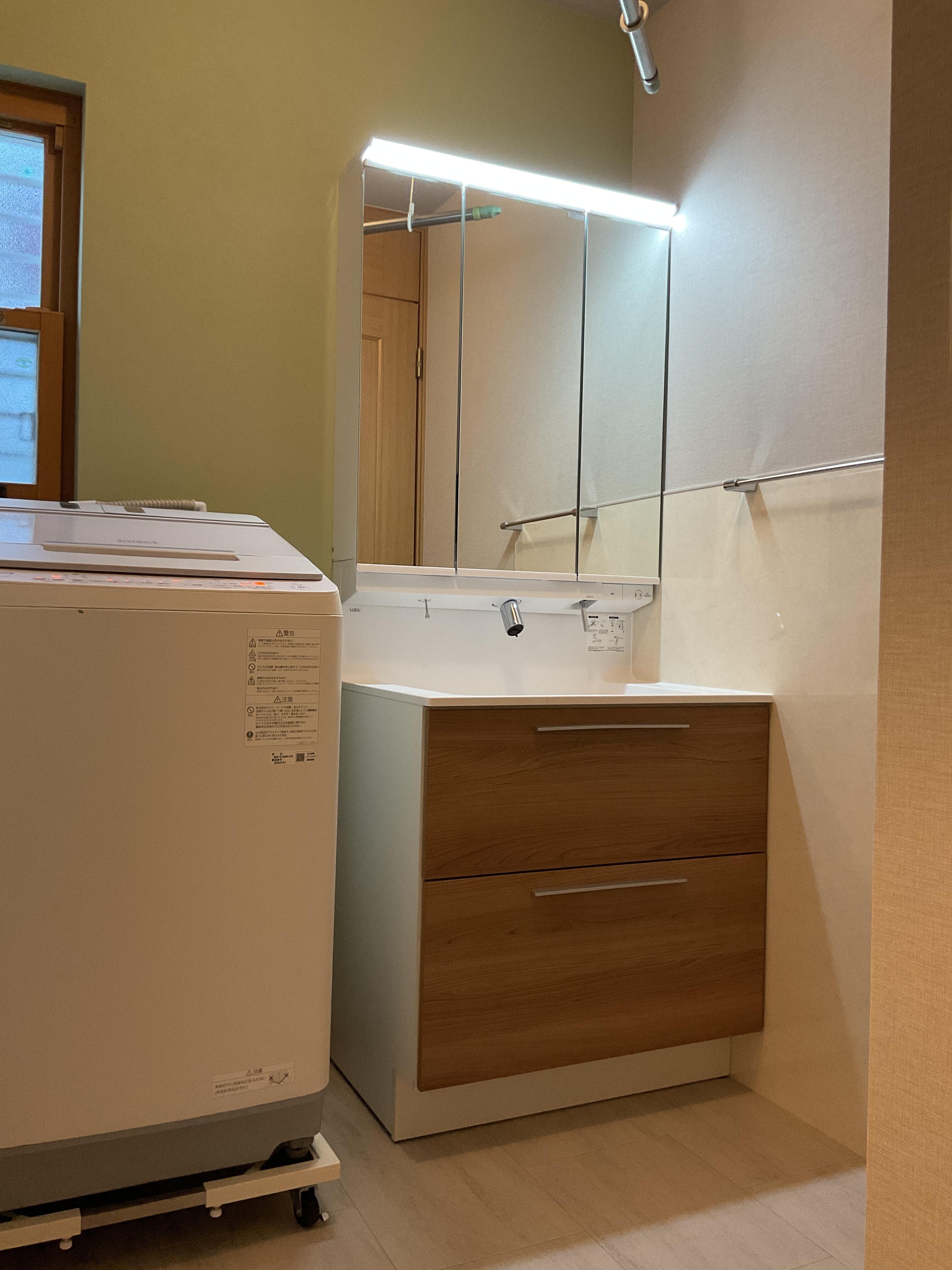 ユニットバス交換交換に伴い洗面化粧台の交換・洗面脱衣室天井・壁・床の ビニールクロス・CFの貼替え工事も行いました。