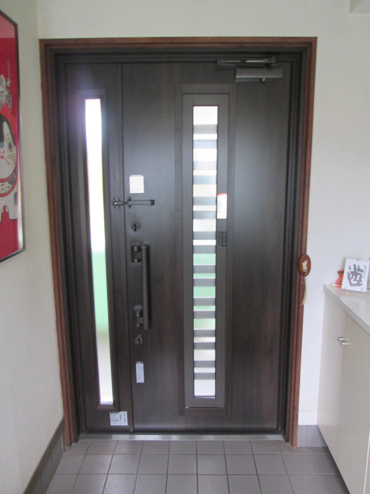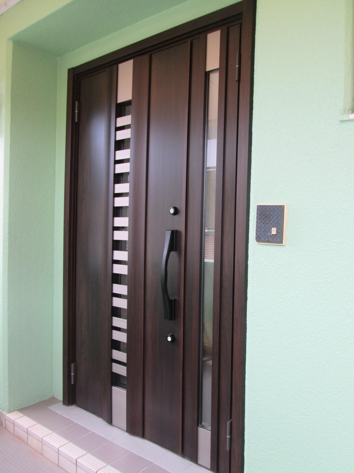 既存の木製玄関ドアを、リシェントで1DAYリフォームしました。既存の枠を利用するため外壁を痛めることなく施工できるので、仕上がりもとてもきれいです。玄関ドアを開けずに換気ができるので、防犯対策も万全です。