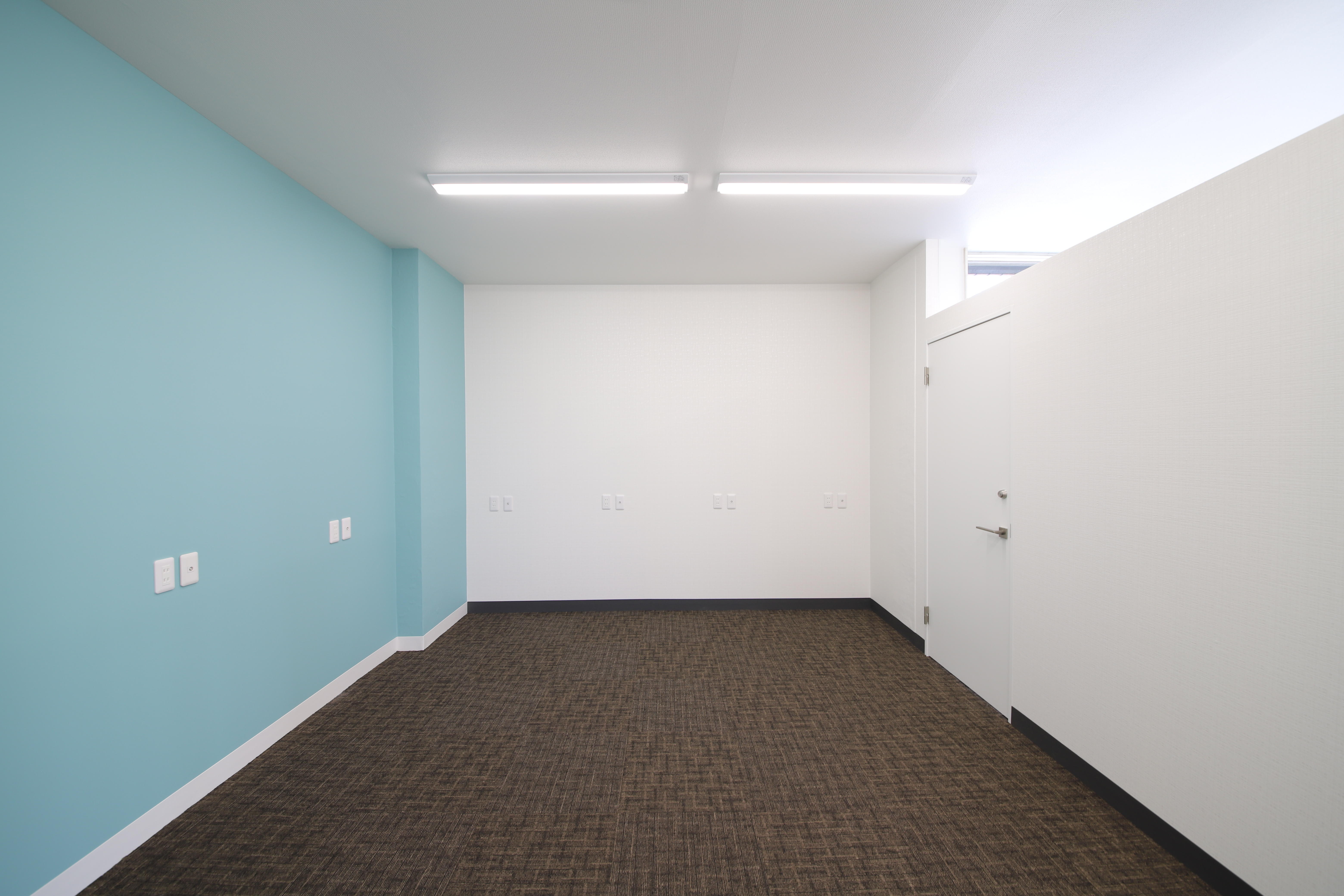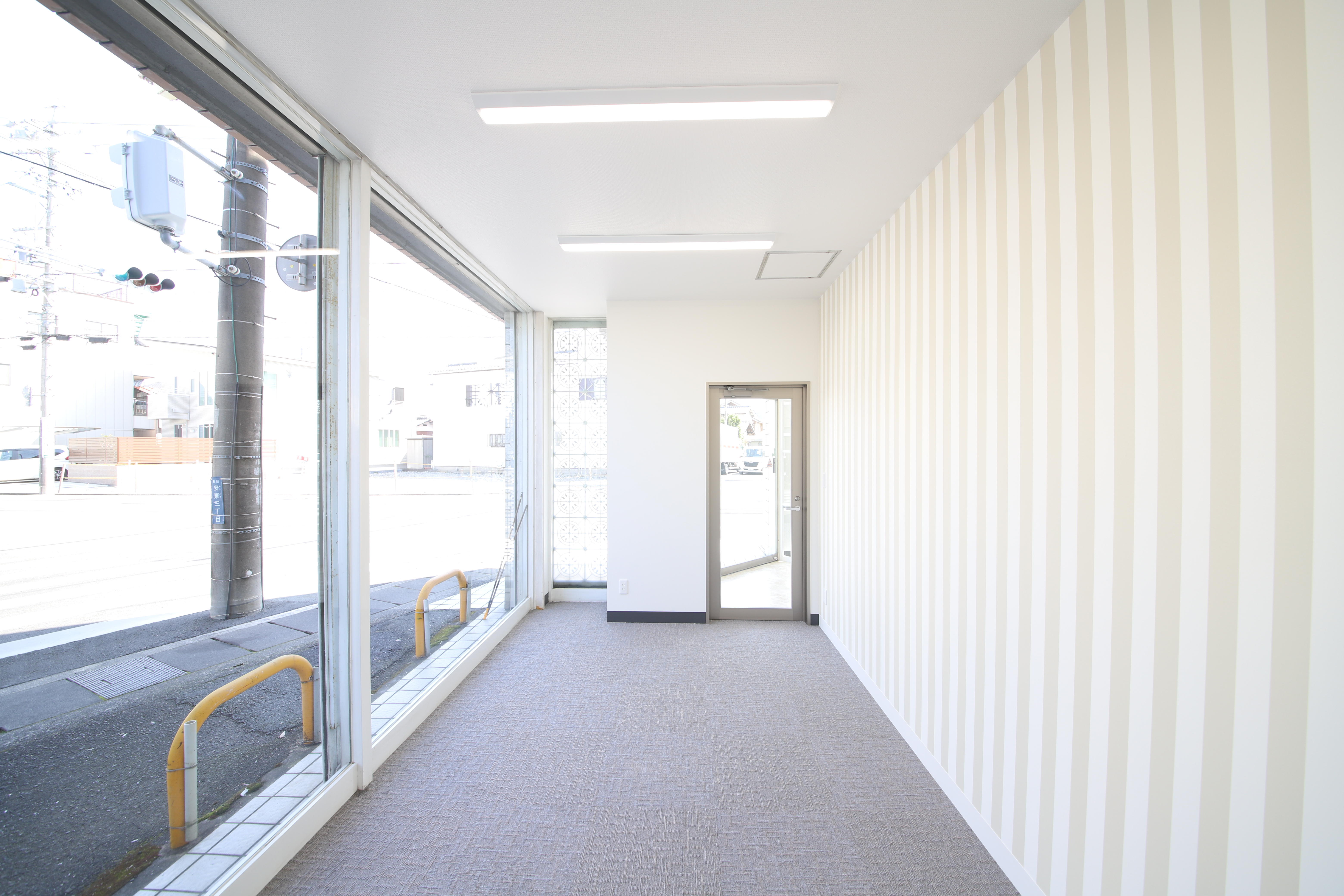 200m2近い店舗フロアを、新たに壁を設けて2区画に分割。 元電気屋さんの店舗入り口はガラス張りでしたが、風防を設置して、事務所として使い易い導線を確保しました。 その他、天井・壁のクロス張替え、床を絨毯に張替えました。