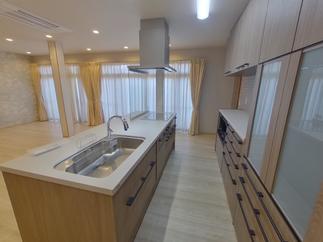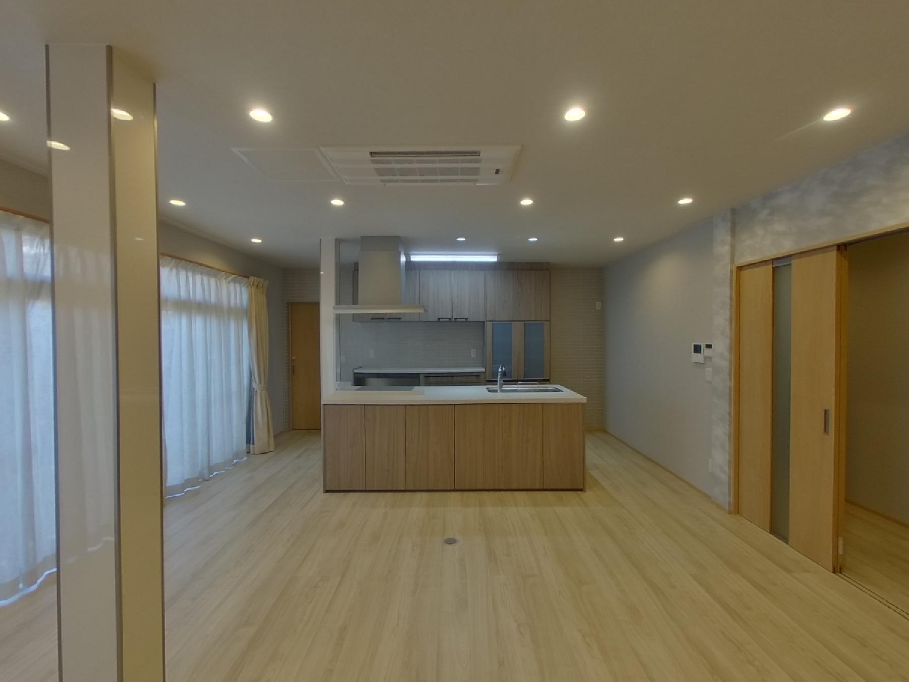 1階の子世帯において挙げられたご希望として、「リビングをできるだけスッキリさせたい」というお声がありましたので、間取りの変更をご提案しました。 8畳部屋・6畳部屋・廊下に関わる、押入れや床の間、小壁などをすべて解体し、1つの空間へと変化させました。また、すっきりとした印象の空間をつくるために、天井照明にはダウンライトを、エアコンは天井埋込の商品を採用し、天井から吊るされる物を極力無くすよう詳細のご提案をさせていただきました。このご提案により、広々とした空間を確保するだけでなく、省エネ効果を高めることが期待できます。 1階のフルリノベーションには、耐震・断熱を取り入れたここちリノベーションを実現させた他、ほぼすべての水廻り設備や建材にIXIL建材をご提案し、高い品質とデザイン性を誇る製品を使用することで、さらに安心感のある空間へと導きました。 住みながらのリフォームのため、ご不便をおかけする場面が多かったかもしれません。お施主様のご協力のもとお施主様にも近隣にも建物にも優しいリフォームを心掛けました。工事を終え、お施主様に喜んでいただけて大変嬉しく思っております。この度はご依頼いただきまして誠にありがとうございました。