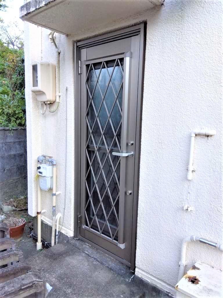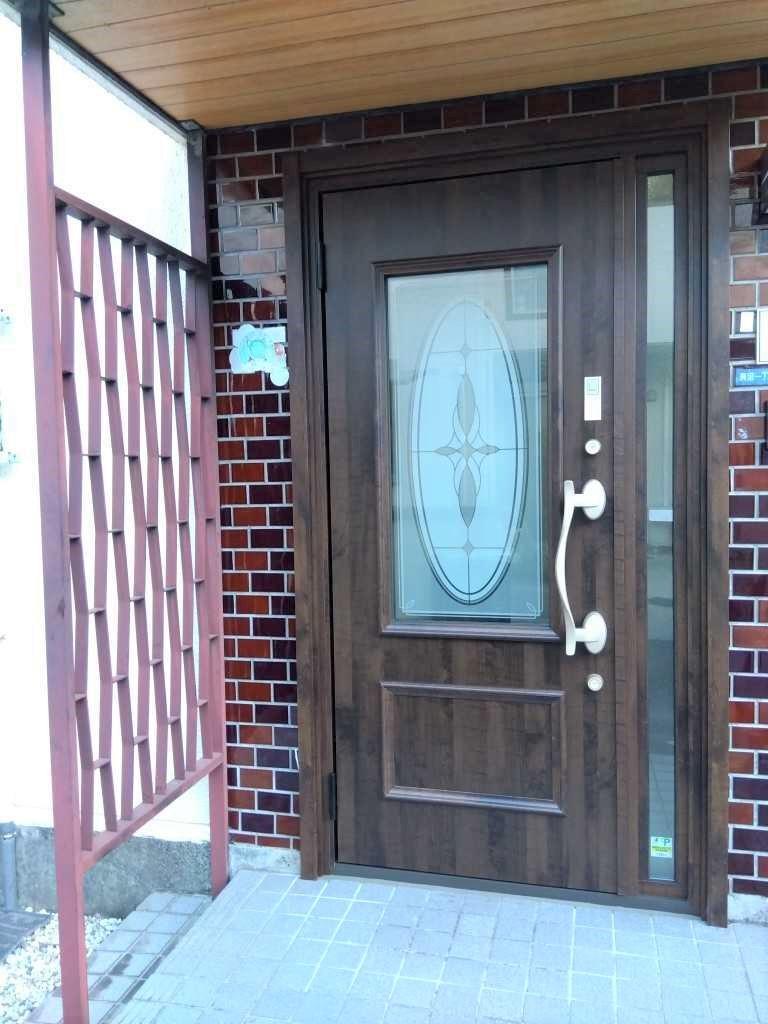 理想の玄関ドアにリフォームできて嬉しかったです! 玄関に光を入れたくて、ガラスの大きいデザインにしました。 防犯ガラスだから防犯と好みのデザインとが叶えられた理想の リフォームになりました。 勝手口は防犯強化のリフォームができたので安心です!