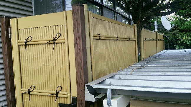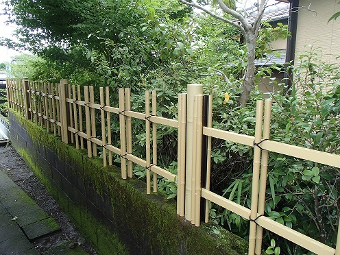 竹垣フェンスを既存ブロックの上に新設しました。周囲は四ツ目垣フェンスでしっとり京風に仕上がりました。