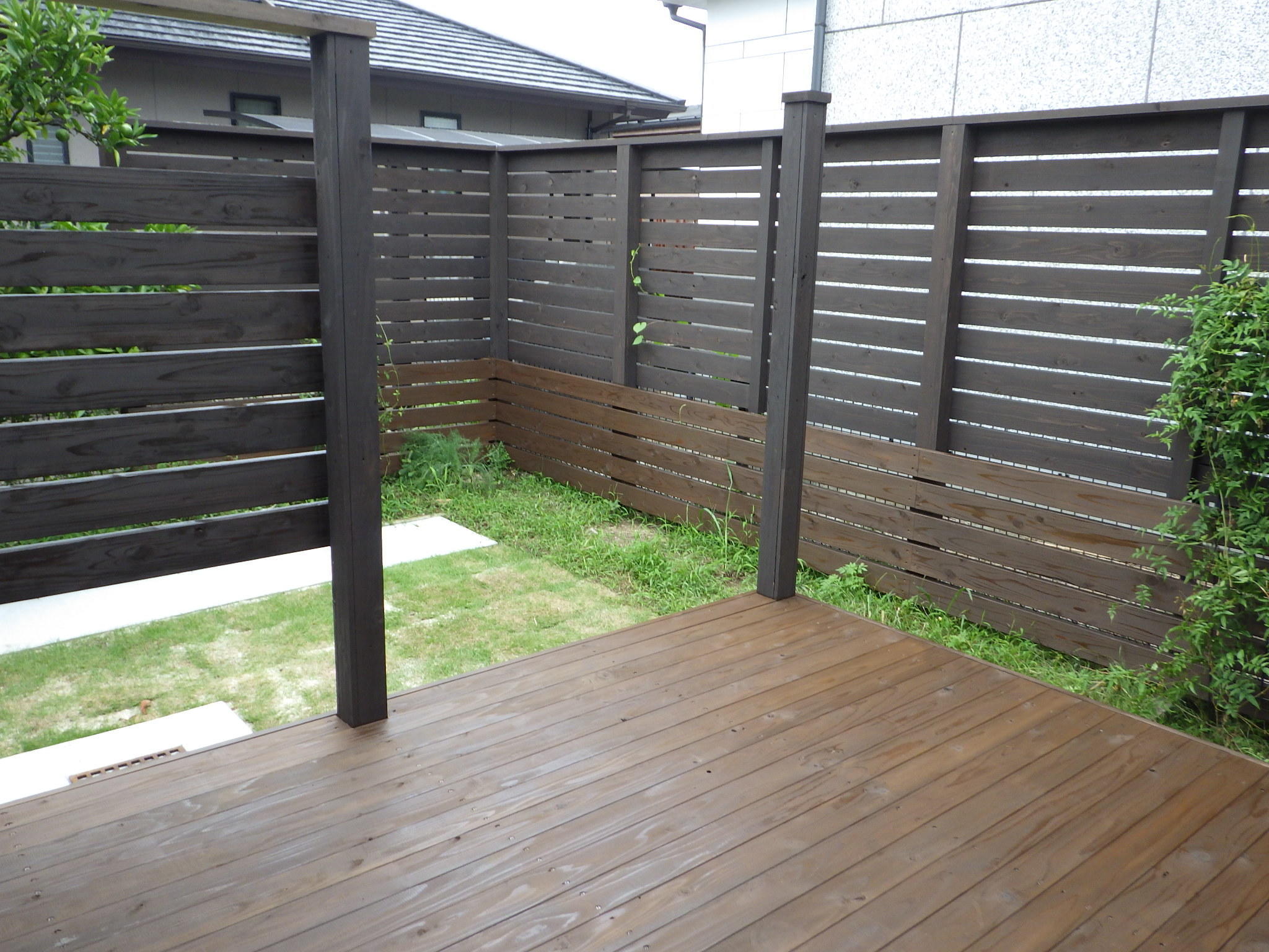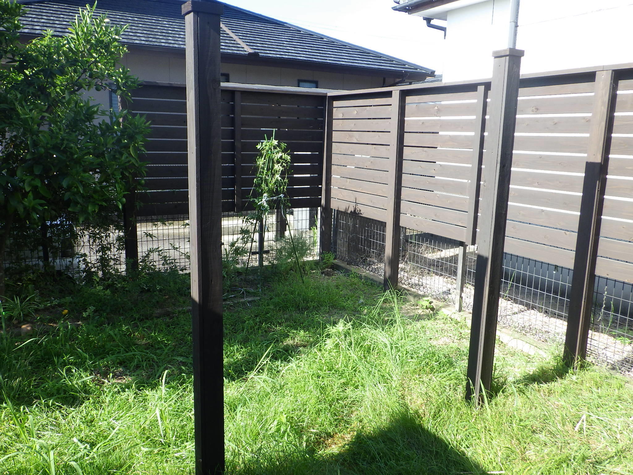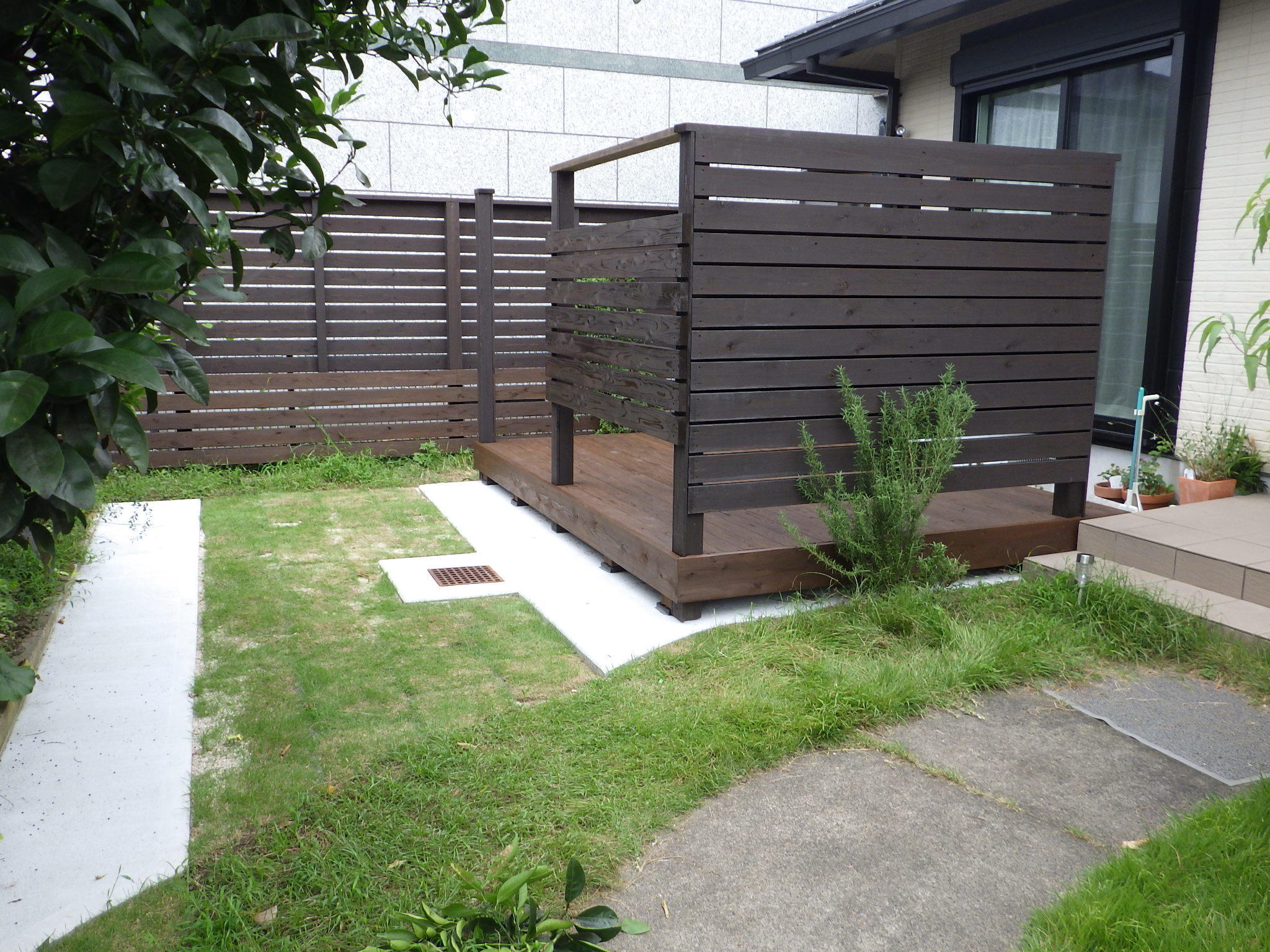 油断をすると草が元気よく育っていた庭。緑の範囲を少なくしましたが、芝生を敷くことで自然な仕上がりになりました。ウッドスペースでは色々な楽しみ方が可能となります。目隠しも圧迫感は無いようですし通気性も損なっていなかったです。