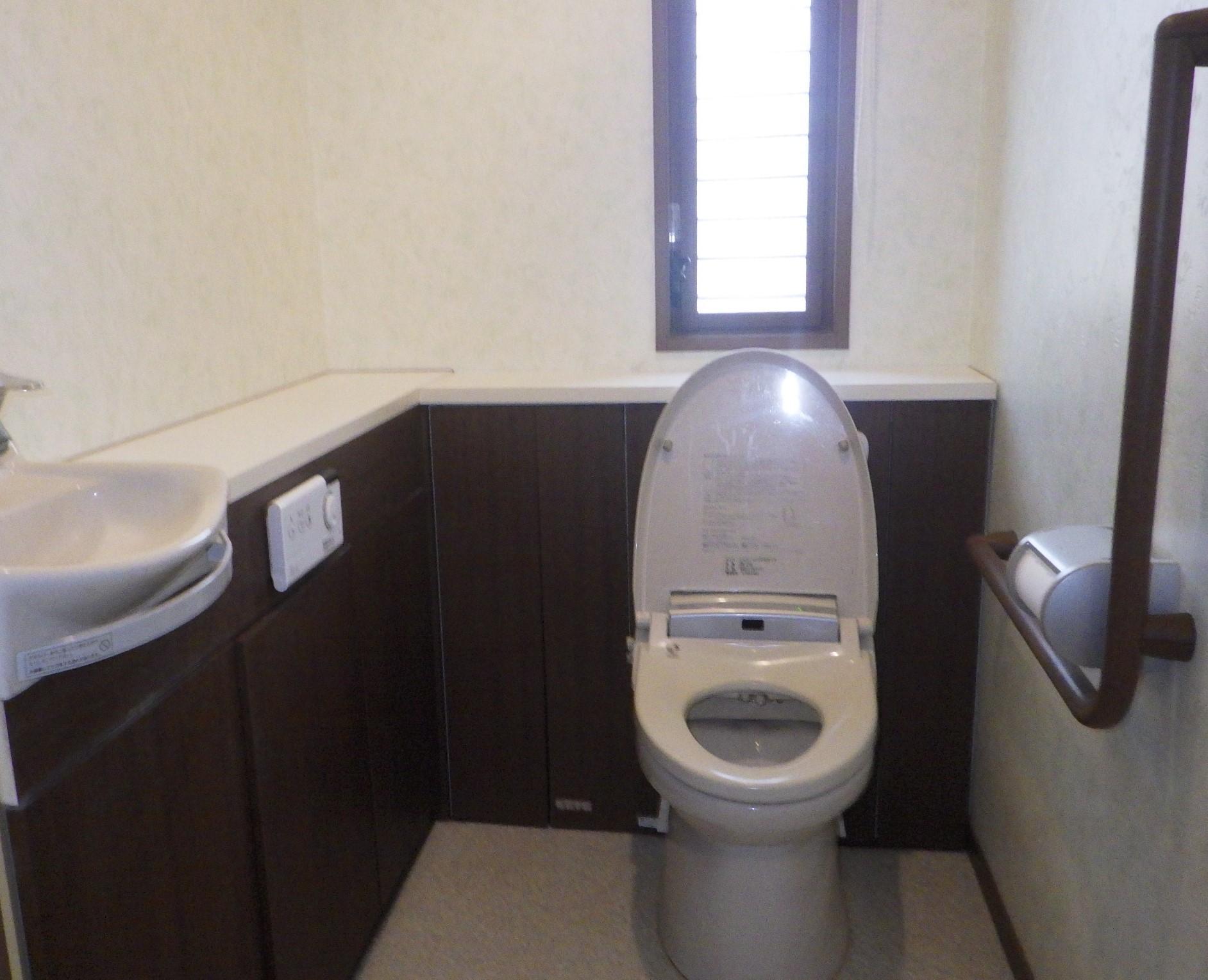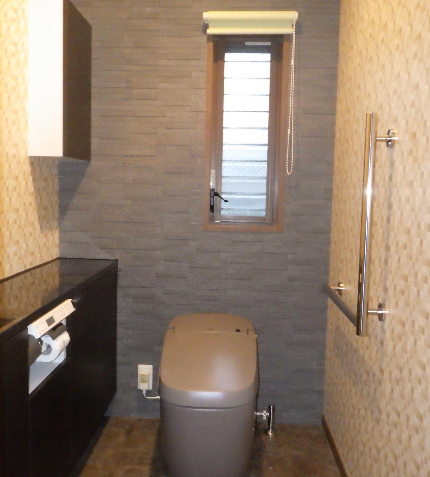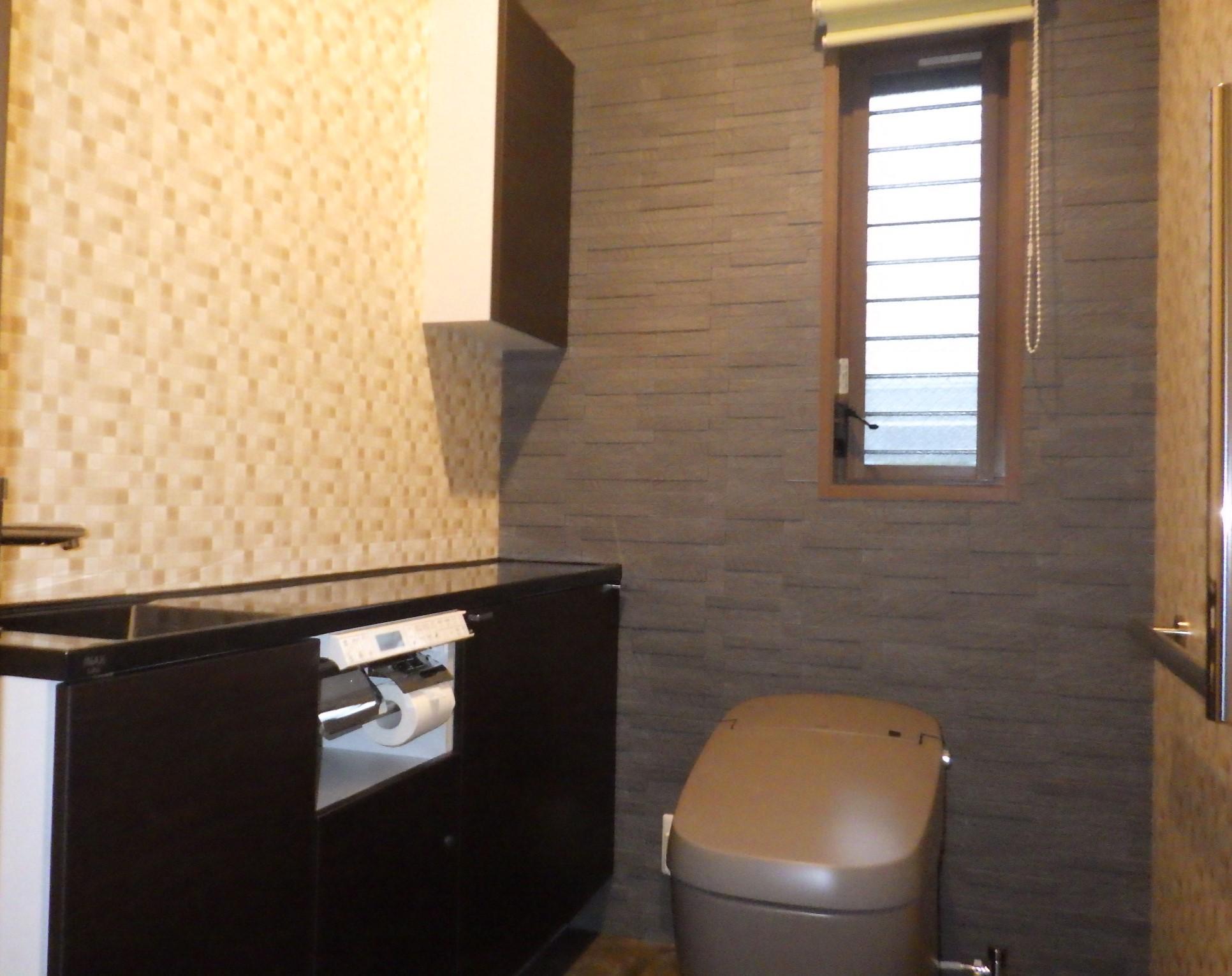 トイレの取替のリフォームでしたが、エコカラットの機能性をお話しし、ご提案しました。せっかくなので壁一面に設置する事にしました。便器後ろの棚を取りスッキリしたので、トイレ全体の空間も広くなったように感じました。収納棚に関しては上にも設置しました。リフォーム前と収納量もほとんど変わらない上に、天板にほこり等も積もらないので、手間が減った!!と、喜んで頂けました。