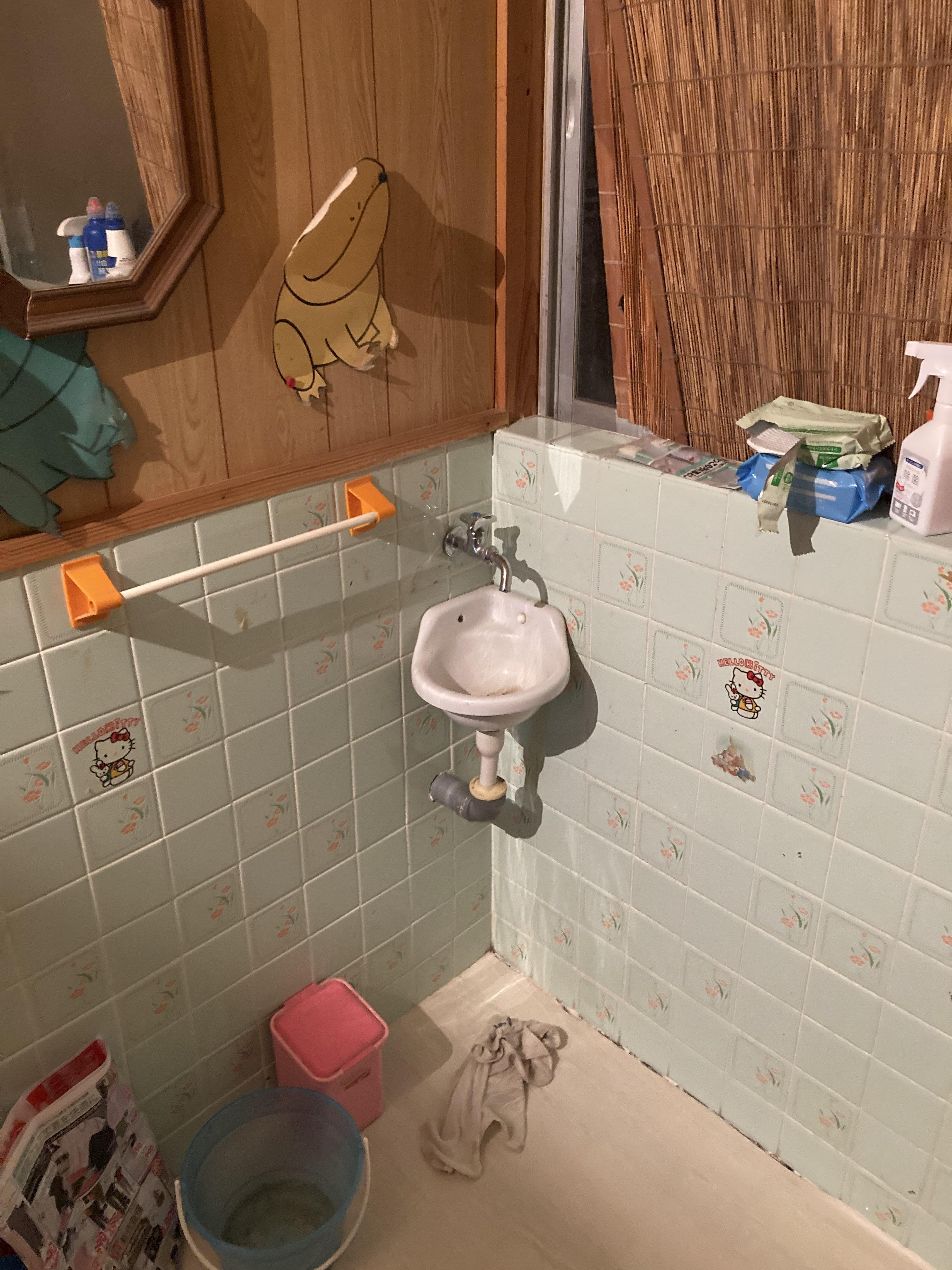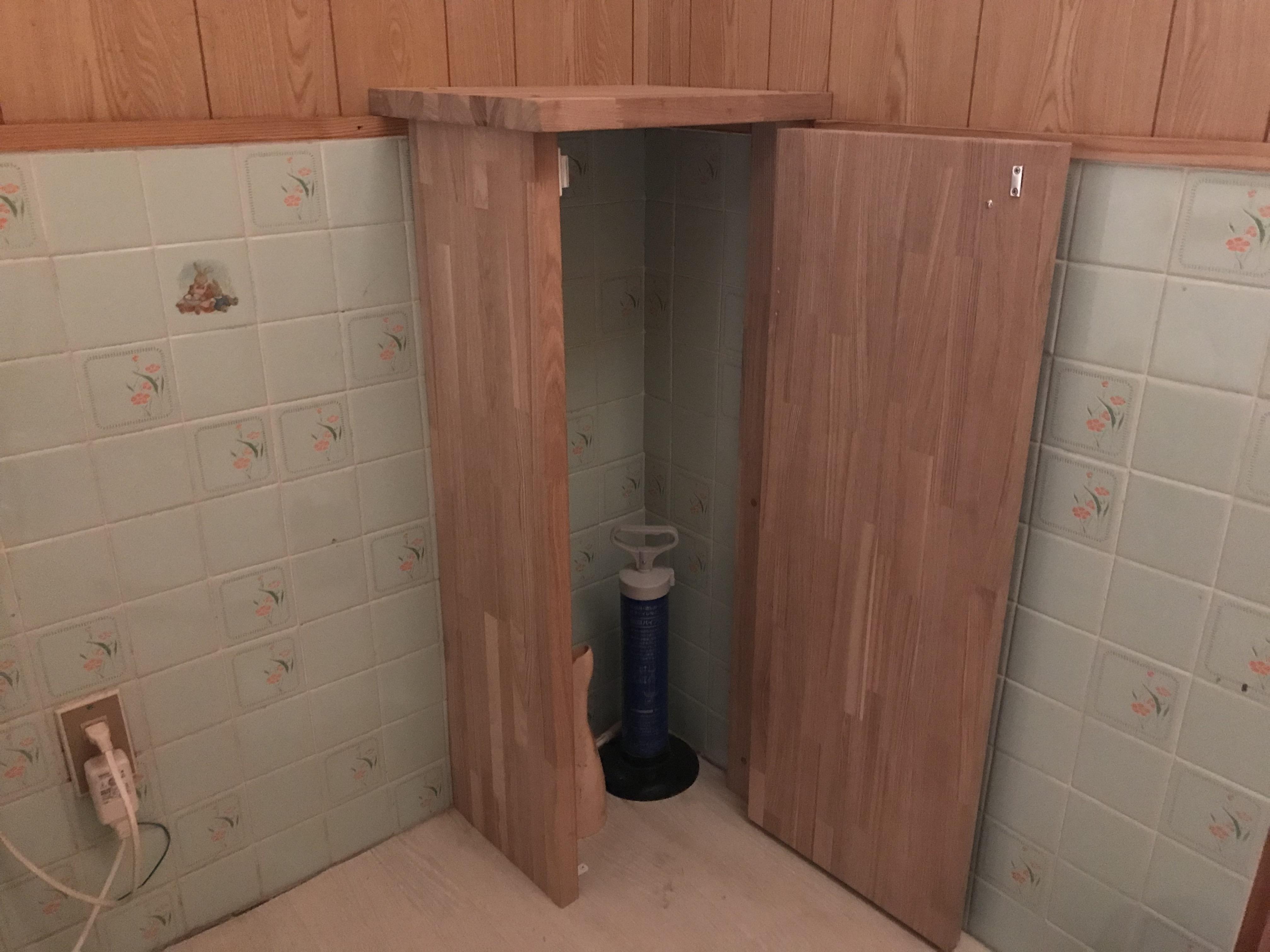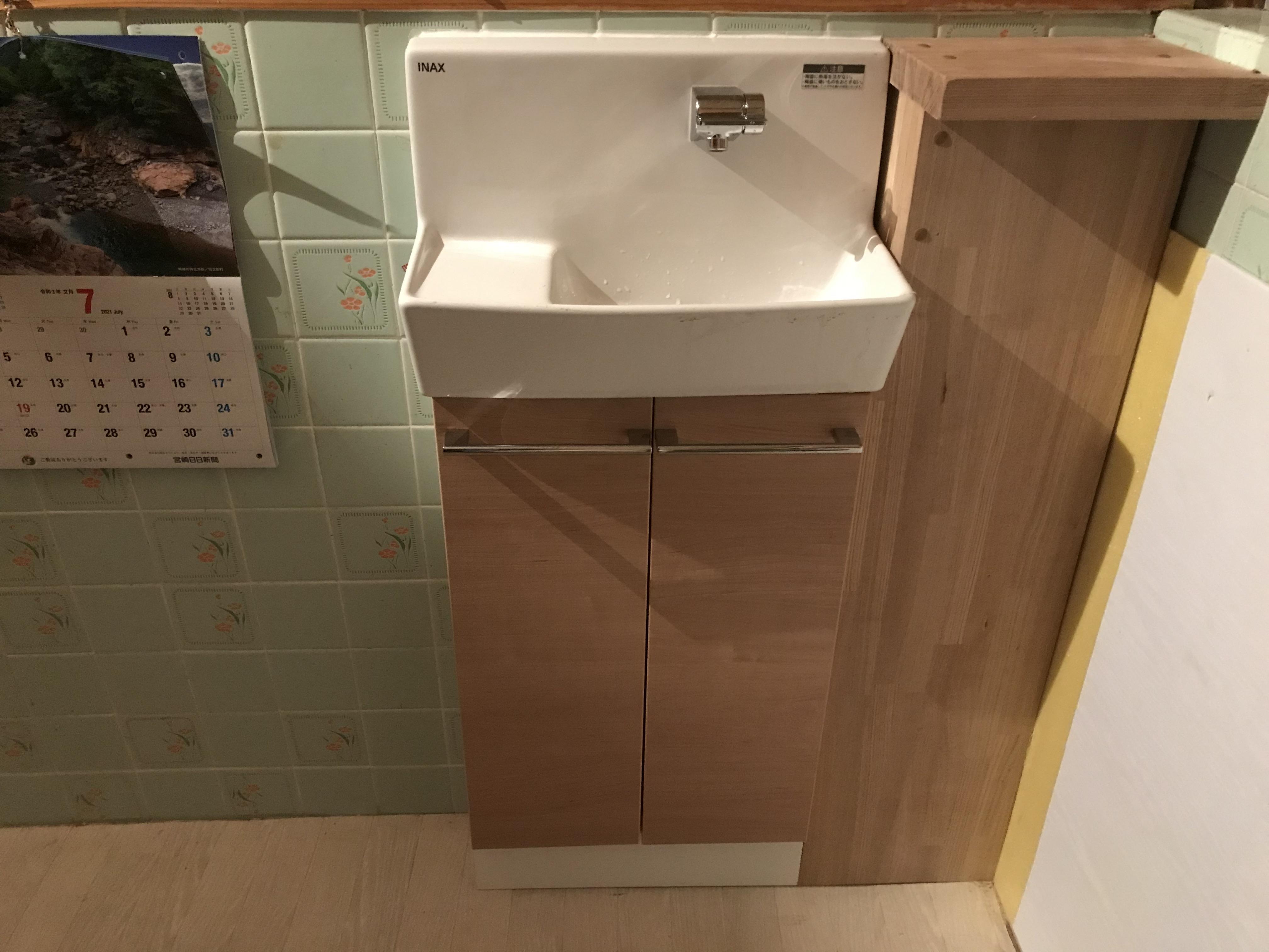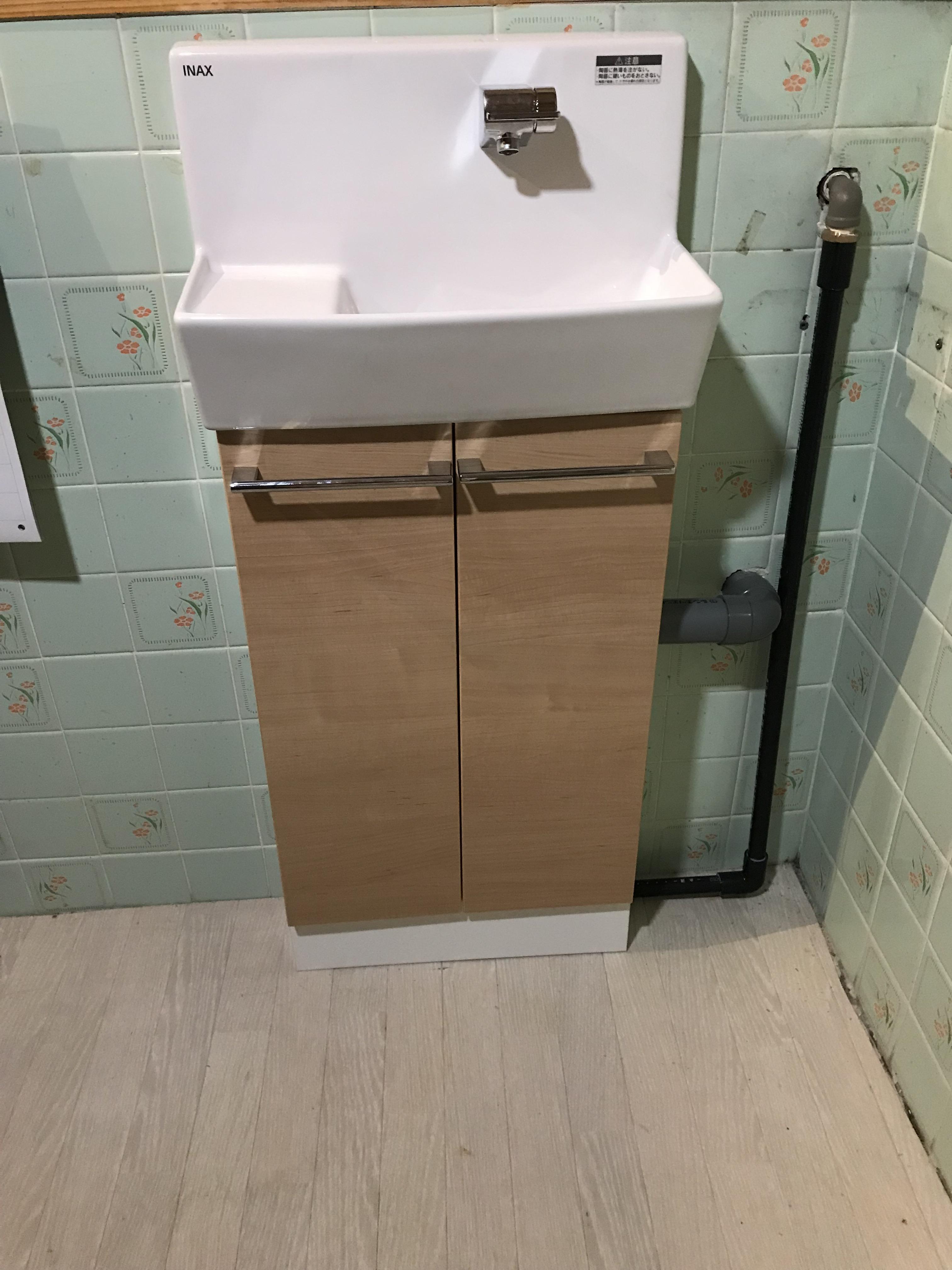 トイレの手洗い器をリフォームしました。既存の配管を延長して利用だったので配管を見えなくするために、収納庫を大工さんが作製してスッキリ収めました。