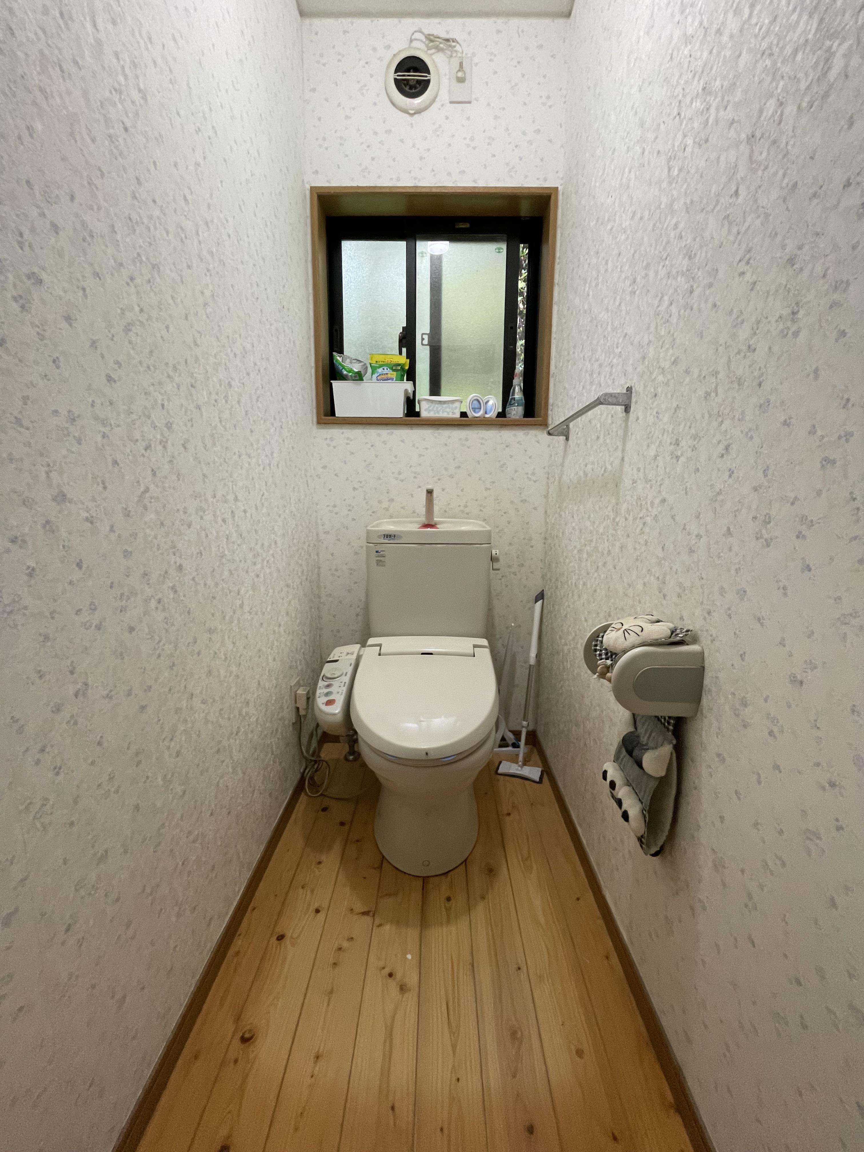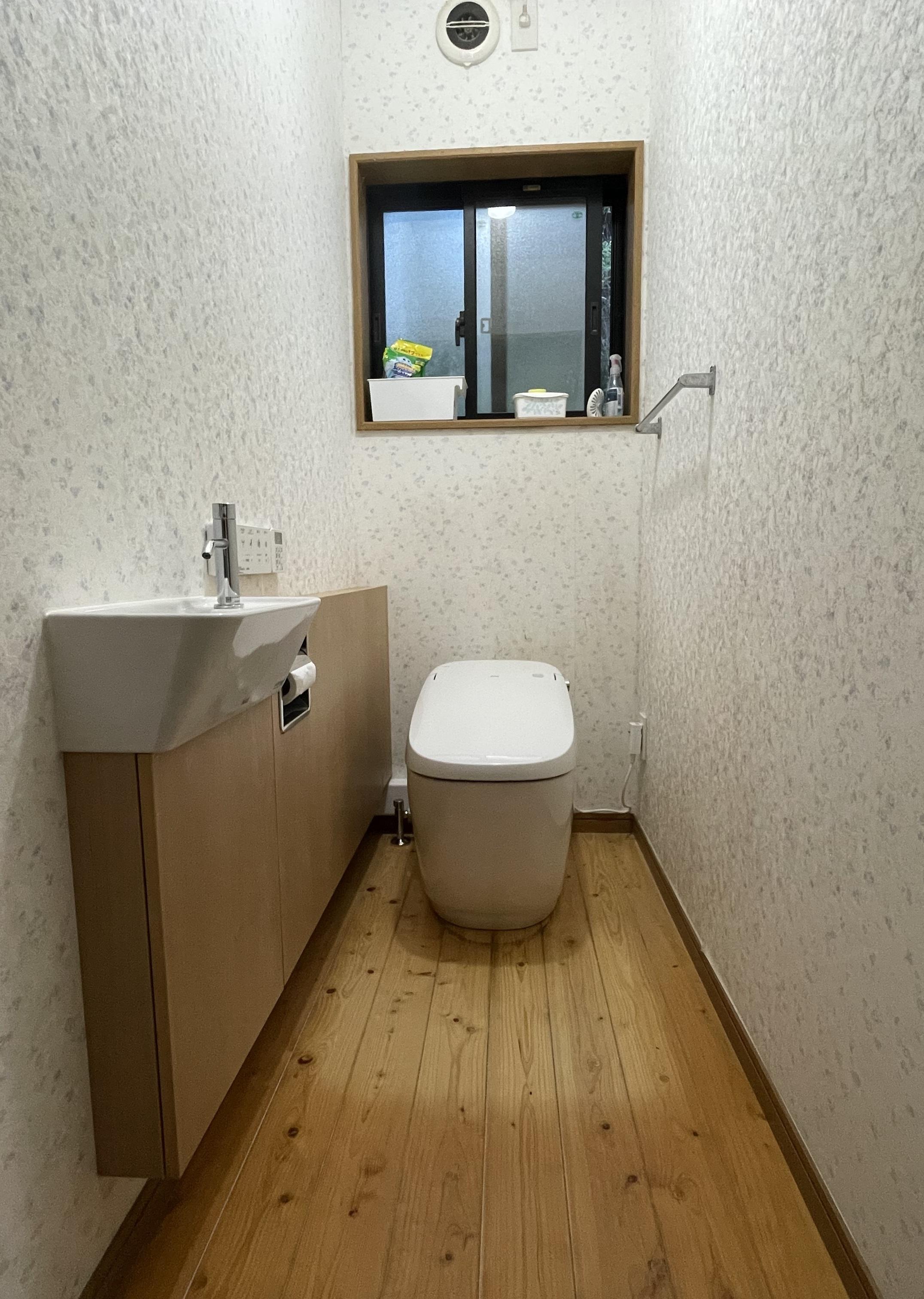 タンクレストイレにリフォームしました。スリムな形態でスッキリしたので、手洗いと収納棚を設置することが可能になりました。