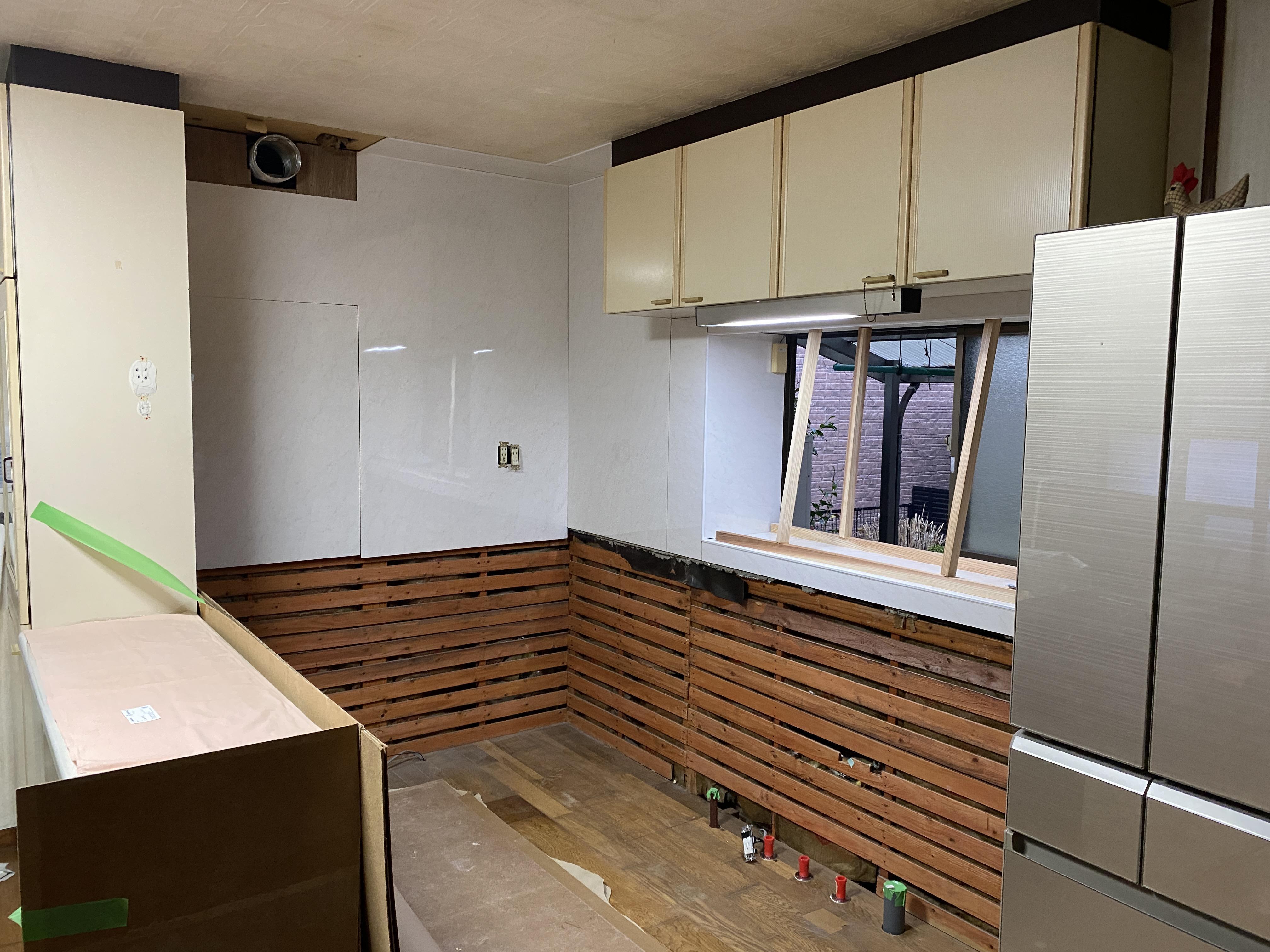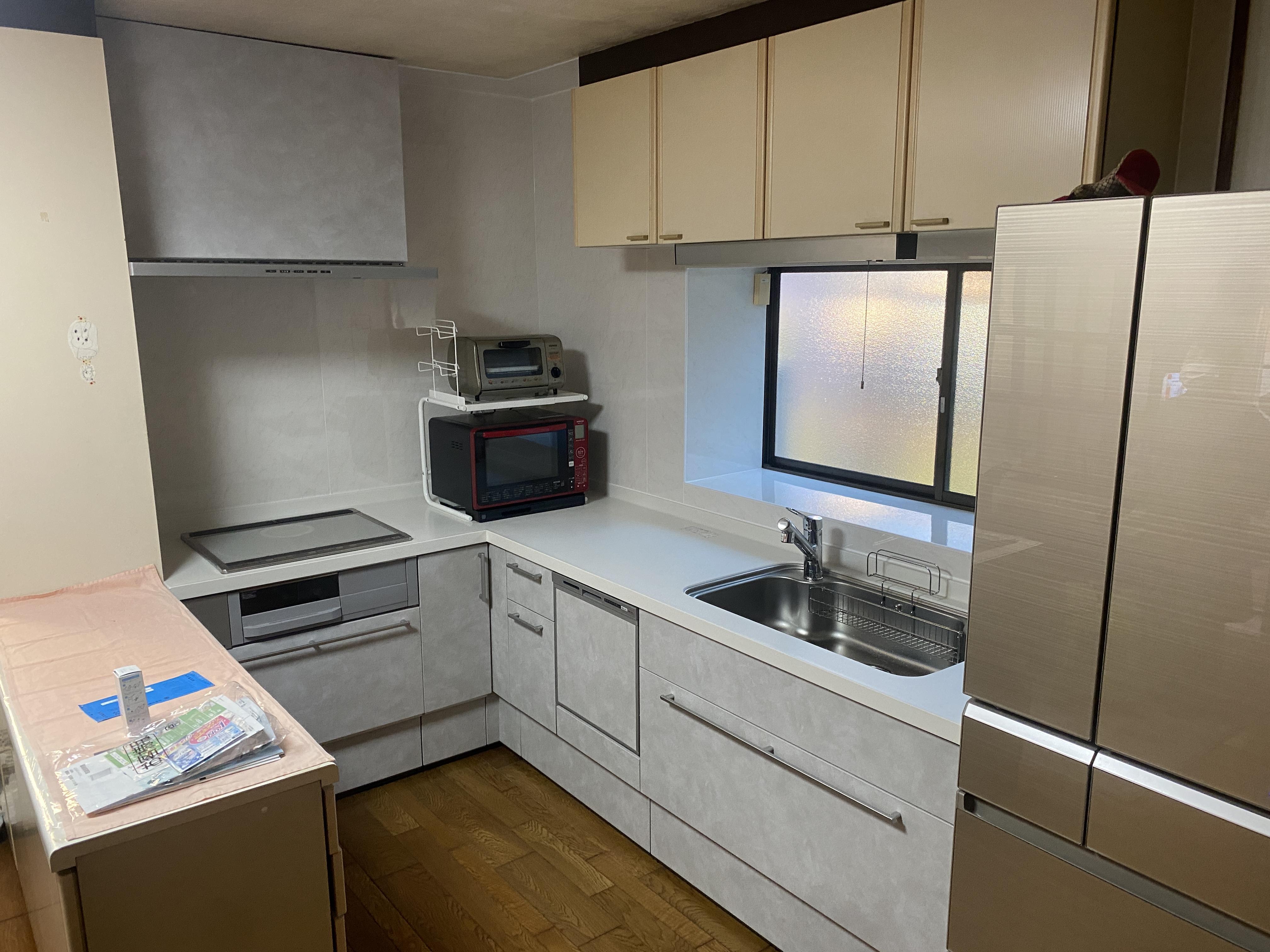 既存のL型キッチンとタイルを撤去して、キッチンとパネル・レンジフードを設置しました。真っ白なキッチンになりとても明るくなりました。以前は置き型の食器洗浄機でしたがキッチン内に収まっているので、作業台もスッキリ広々です。収納スペースも豊富なので、一度体感されると、リフォームの夢が膨らみますよ!是非、ご相談ください。