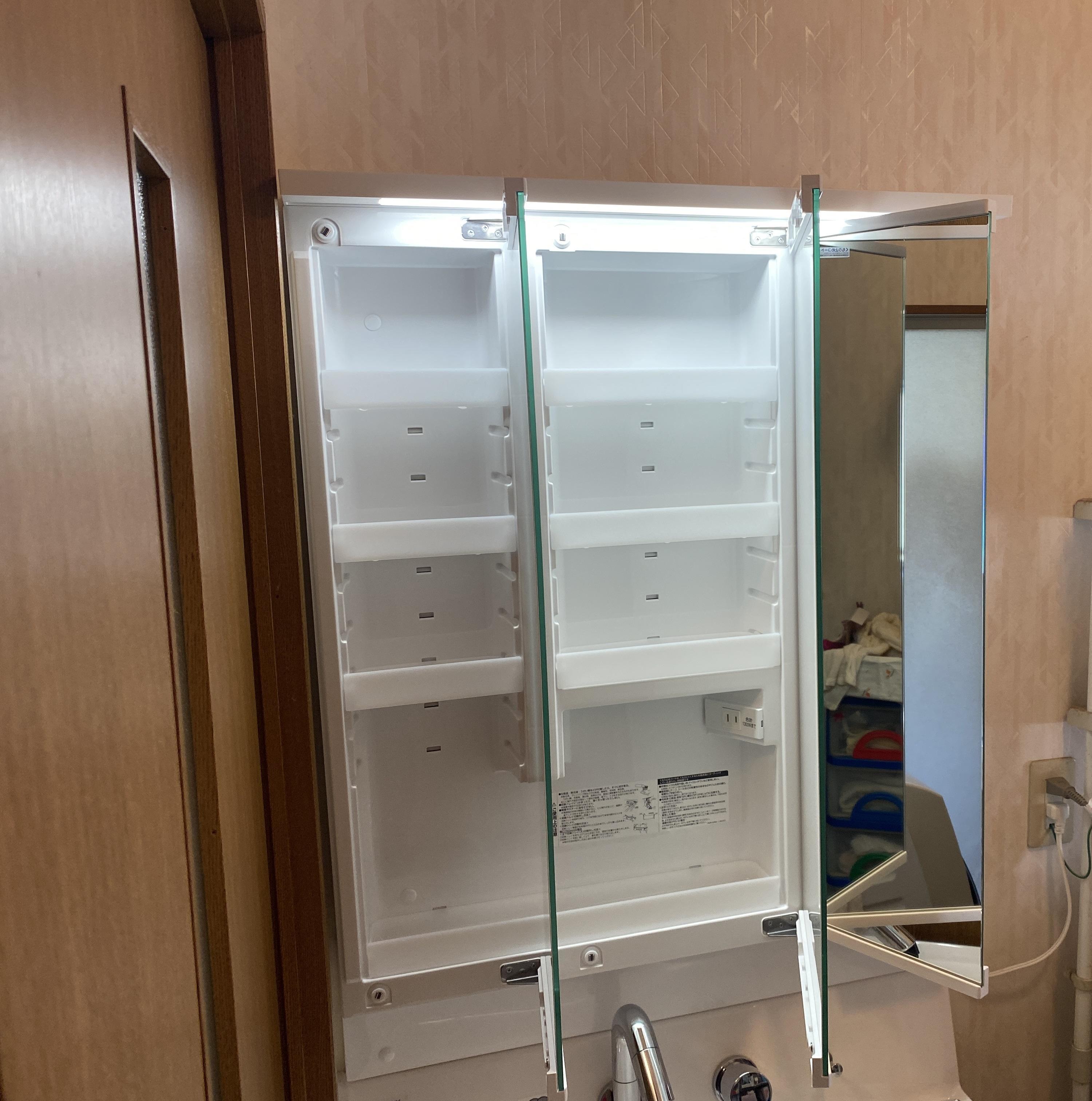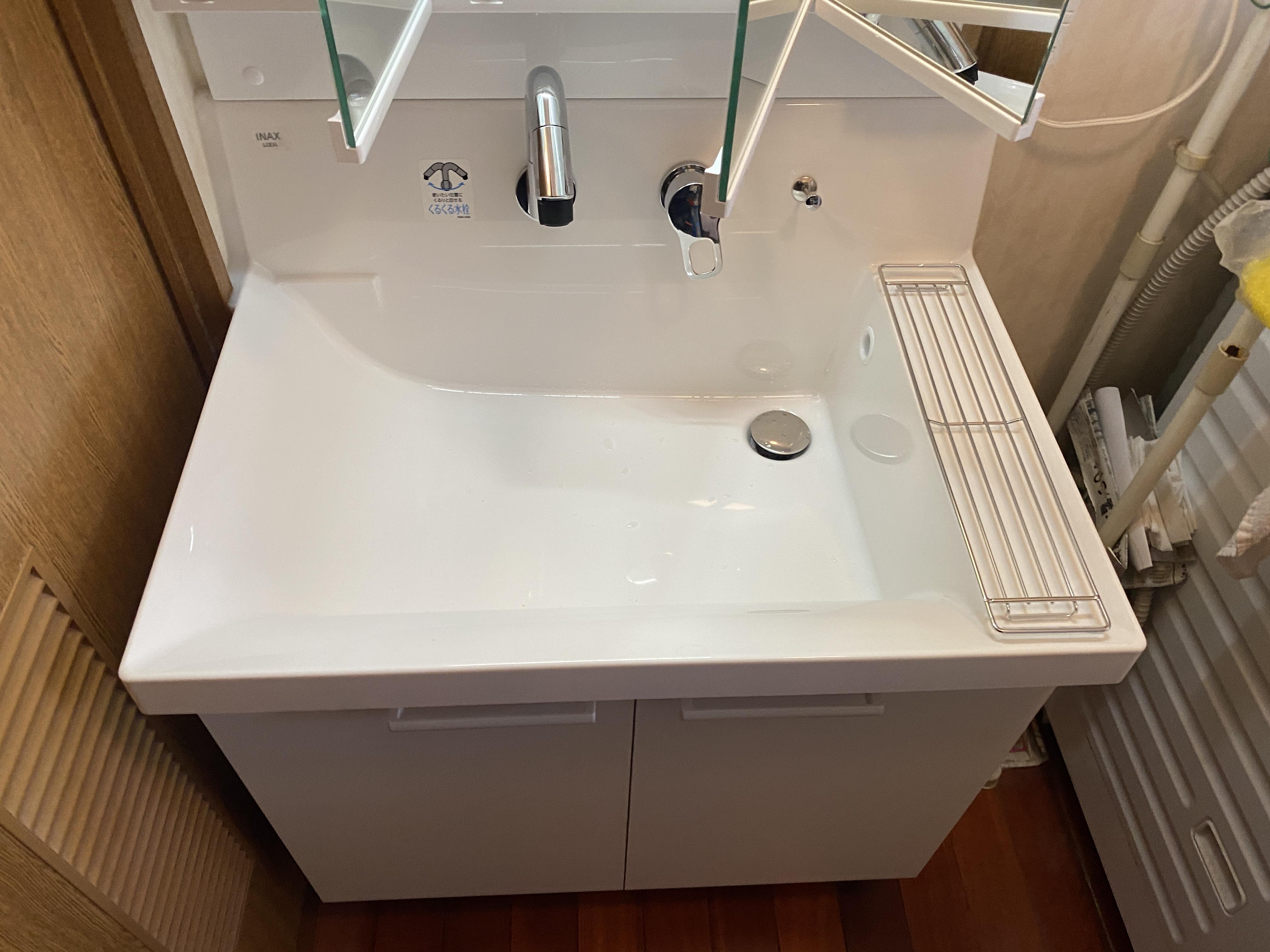 洗面化粧台のリフォーム。水栓が壁付けなので、立ち上がりの汚れが付きにくく、お掃除がとても簡単です。水栓がクルクル稼働するので、バケツの水汲みや、二人並んでもクルクル動かして手元に蛇口を持ってこれるので、とても使いやすいですよ!ボウルは深く、広くて平らなのでとても作業しやすいと好評です。
