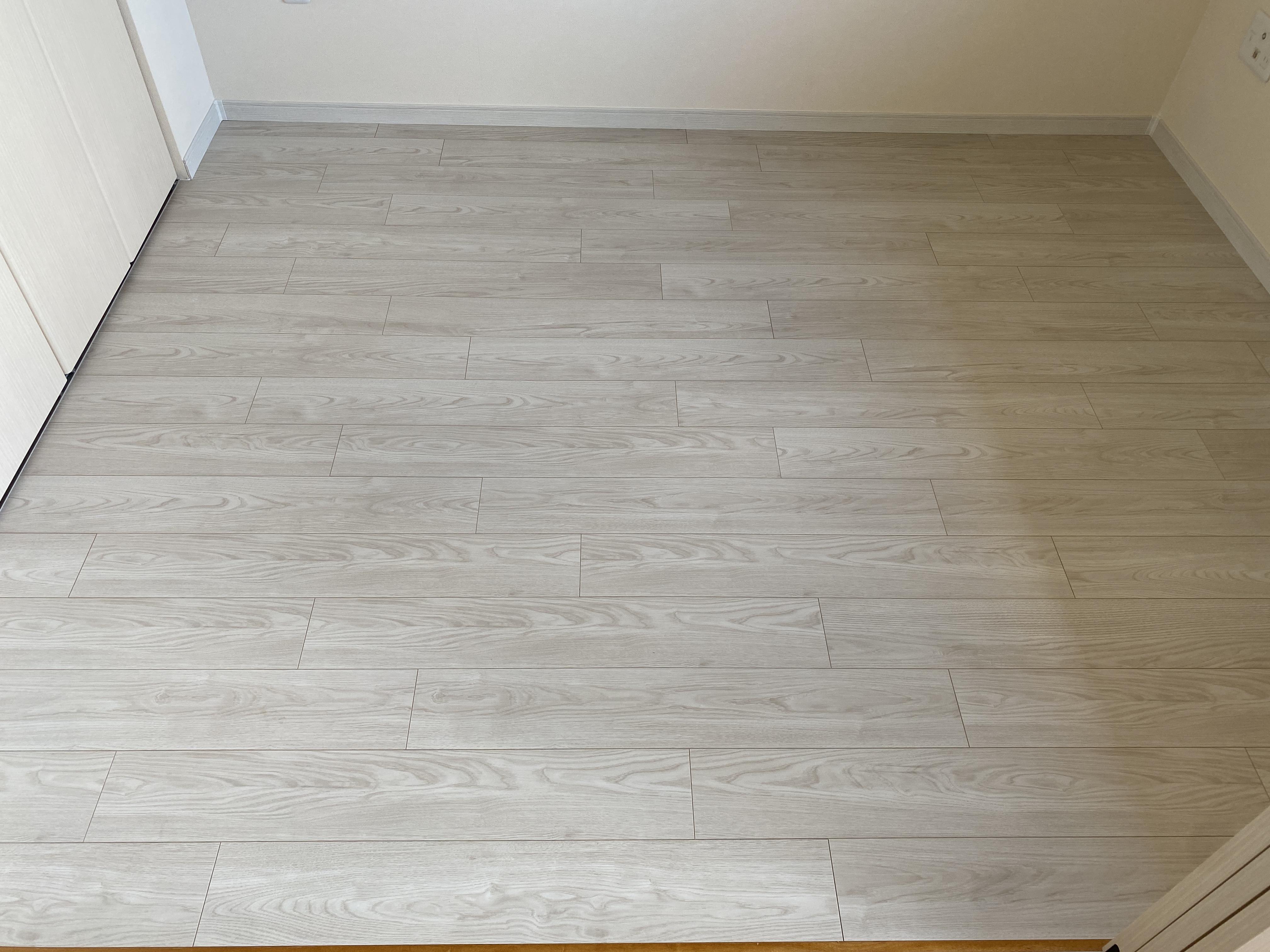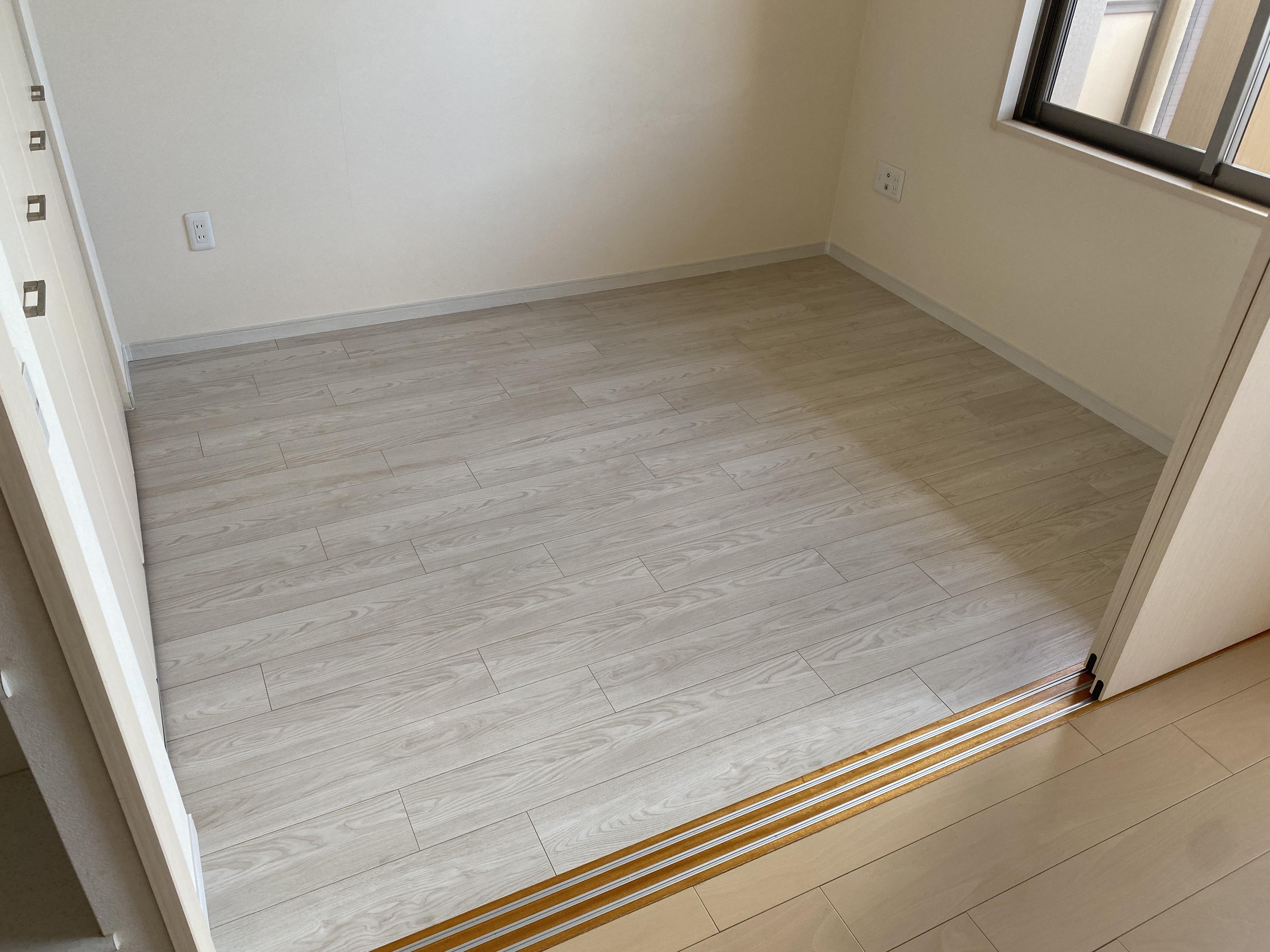 畳を、フローリングへのリフォーム工事をしました。和から洋へ自由自在。リフォームで夢が膨らみます。今回、施主様が『ハーモニックホワイト柄』の明るめなカラーを選ばれたので、とても明るい部屋となり、広く感じました。