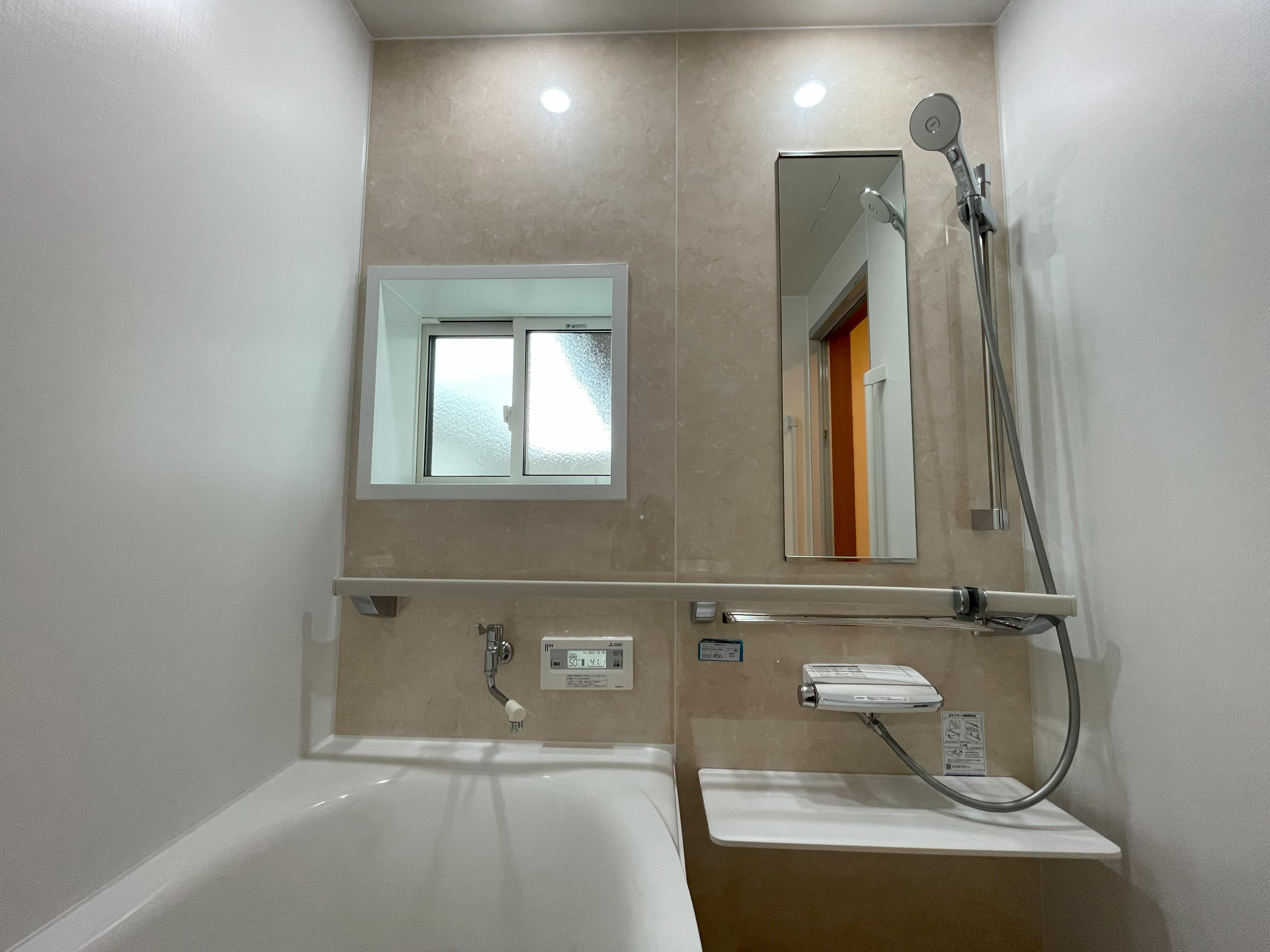 総タイル張りの浴室をユニットバスへのリフォームです。窓からの冷気をカットするために窓を小さく仕上げる大工工事をしました。寒い冬になる前に工事が完了してよかったです。