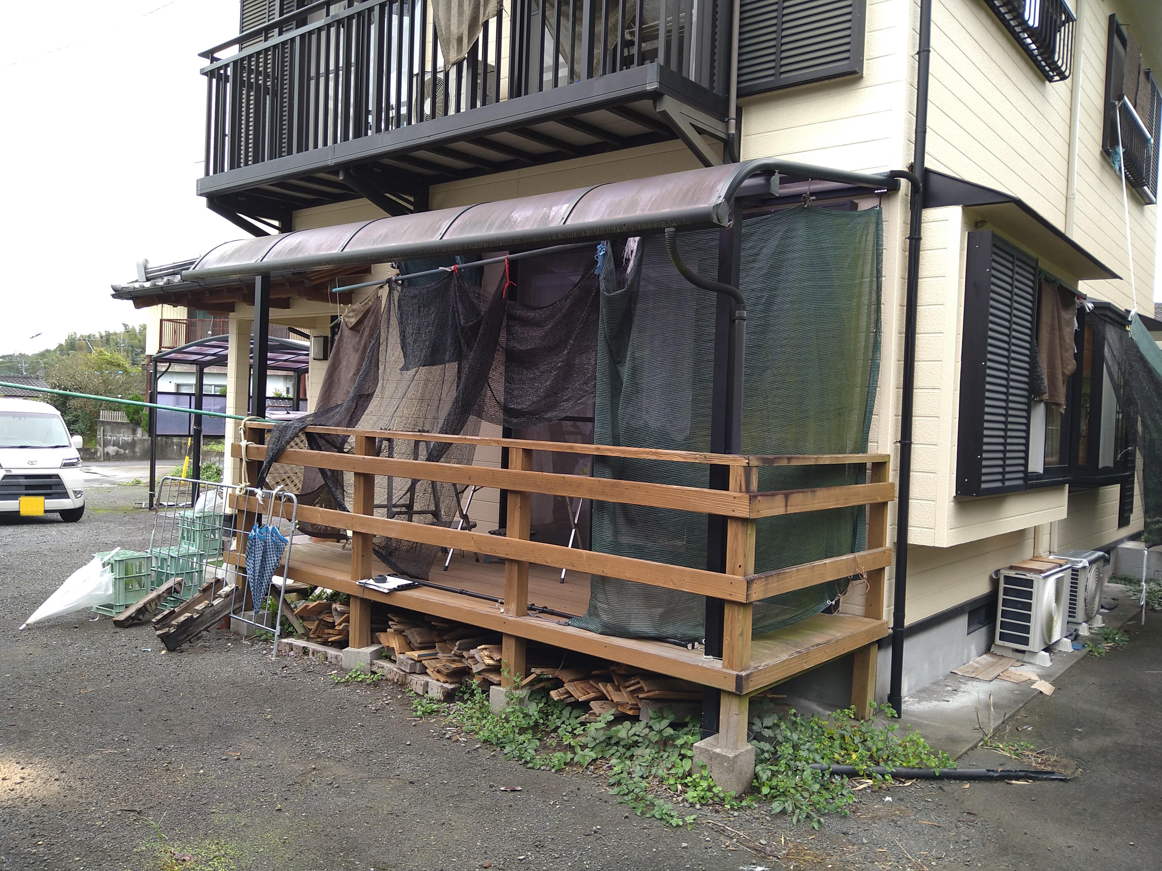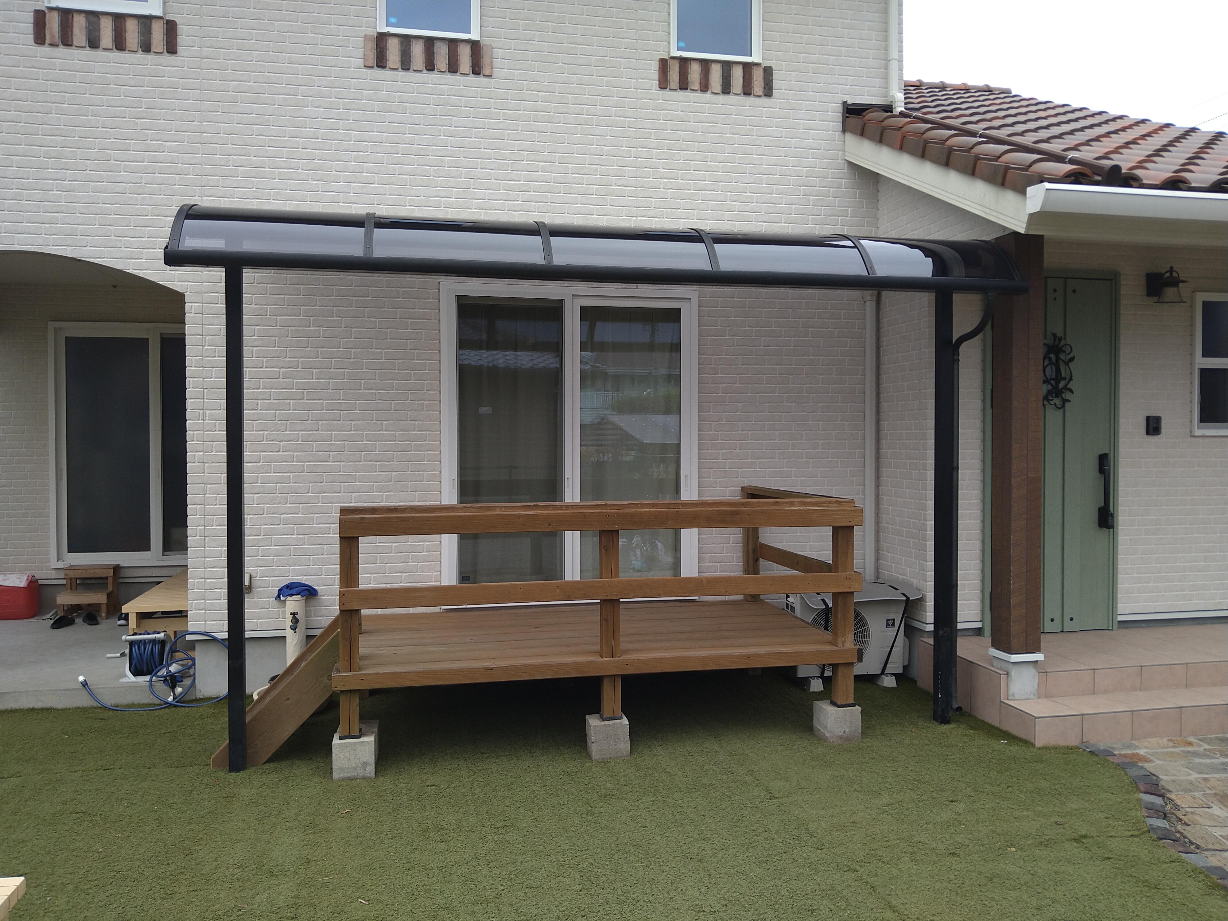 サンルーム設置工事をさせて頂きました。元々のテラスもまだ使用出来る為、娘さんご家族の家へ木製デッキと一緒に移設です。サンルームは、明るく開放的な空間になり、天候に左右されずにスペースを活用できオススメです。