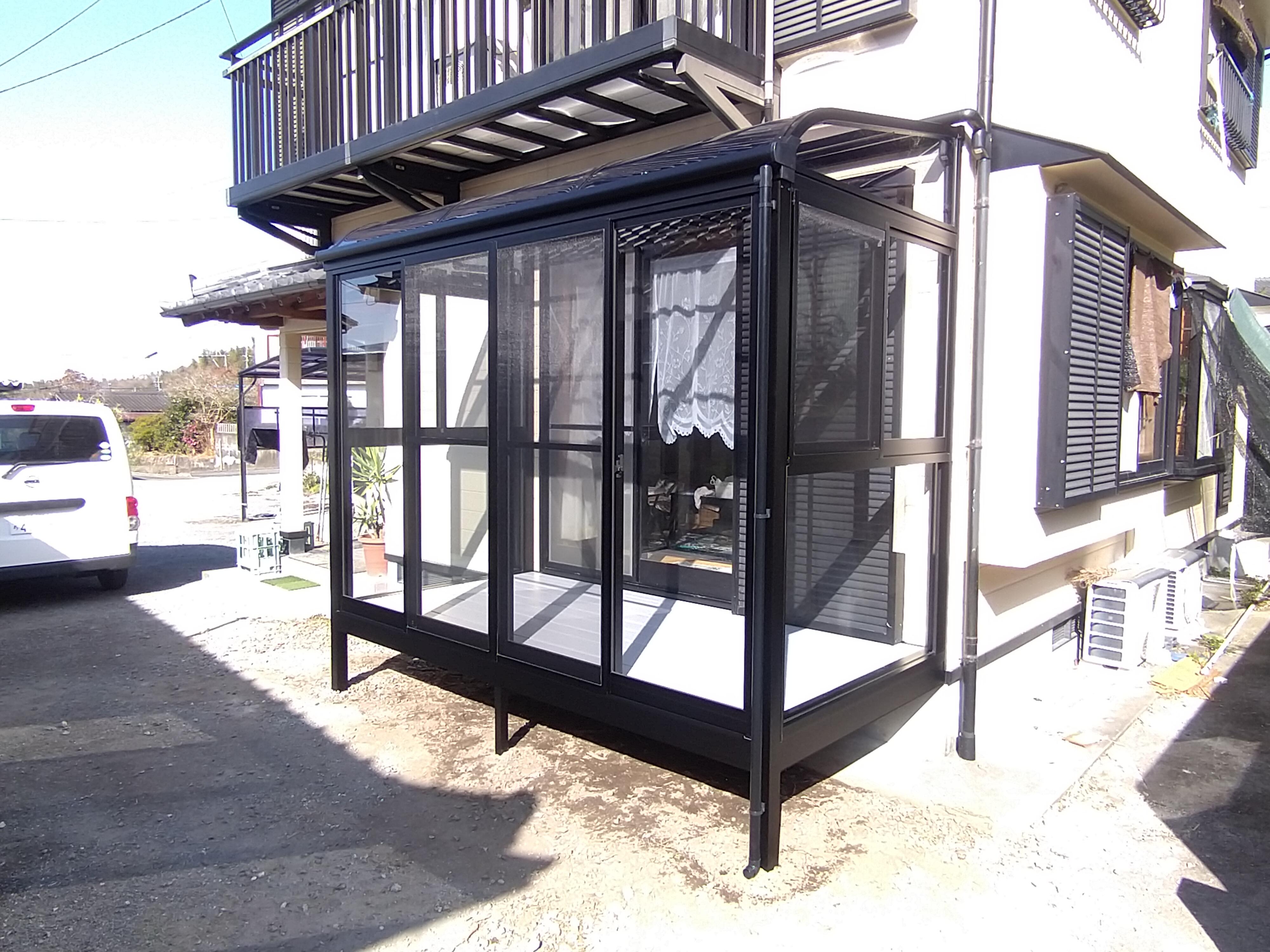 木製デッキ撤去(移設)とテラス屋根撤去(移設)後、サンルーム設置しました。