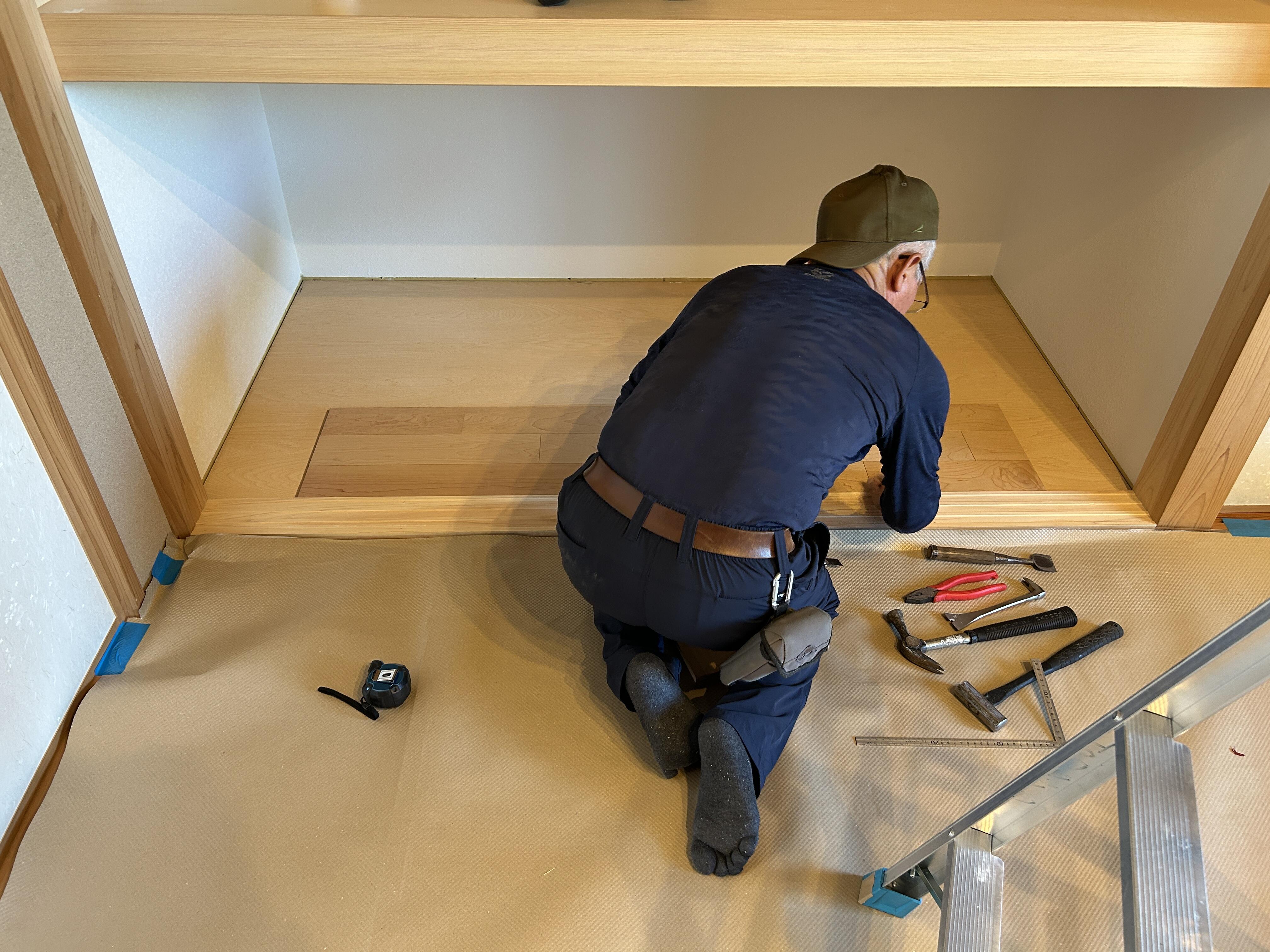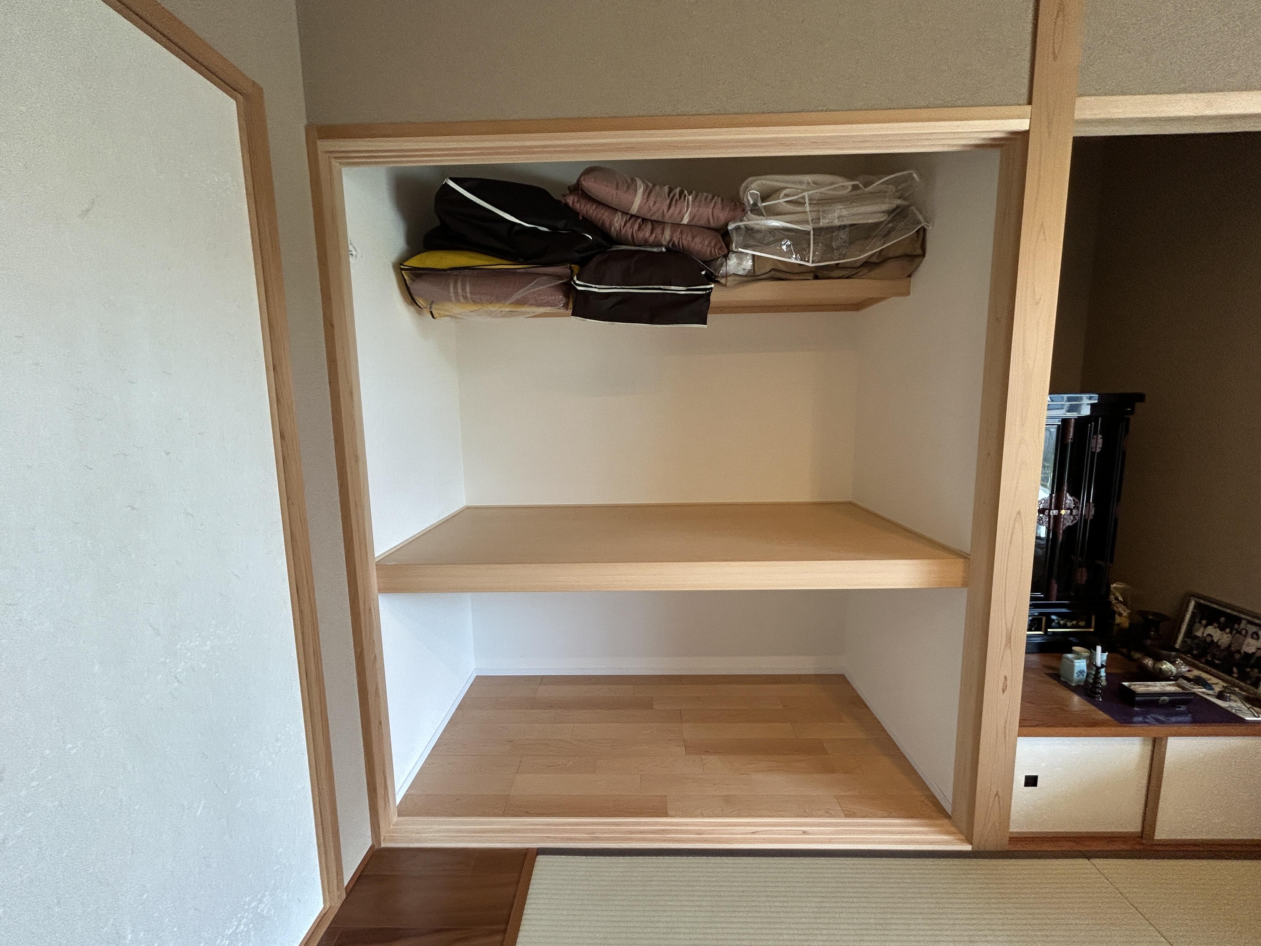 既存の鴨居・敷居を外さず新しく鴨居・敷居を取り付け、押し入れ内に段差が生じないよう床は大工さんにフロアー材を重ね張りしてもらいました。 襖の柄を選ぶ際、襖の製作業者さんに提案していただいた柄をお客様が気に入ってくださいました。立て込みをした際も「この柄を選んで良かった!」と言っていただけて嬉しかったです。