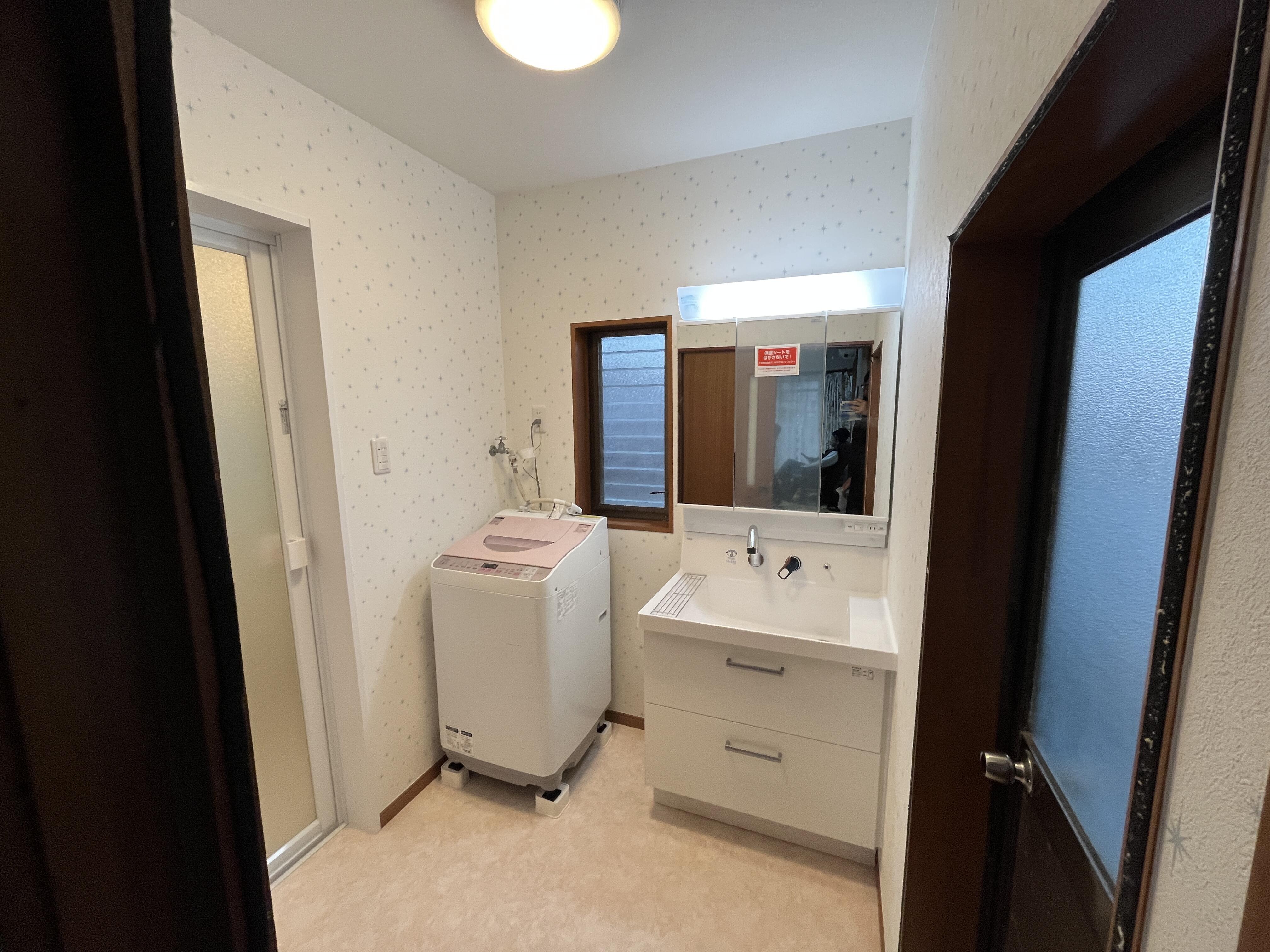 ・洗面化粧台取替 大工工事で、部屋の拡張をしました。脱衣室が広くなったことで、洗濯槽の向きを変えて設置できたので、洗濯物の取り出しがスムーズになると思います。