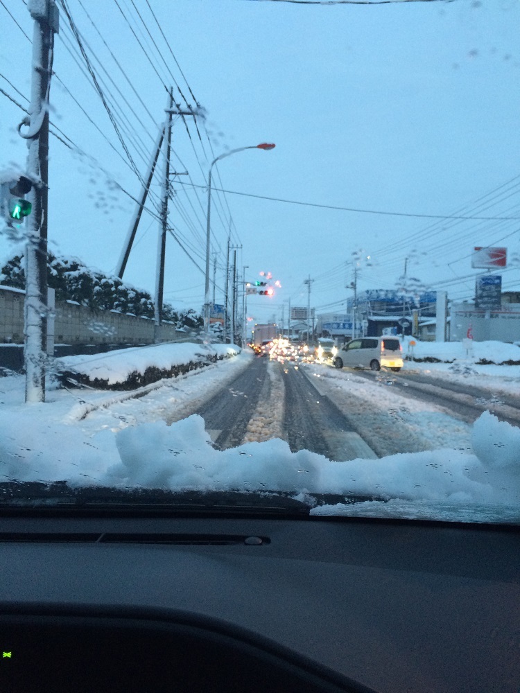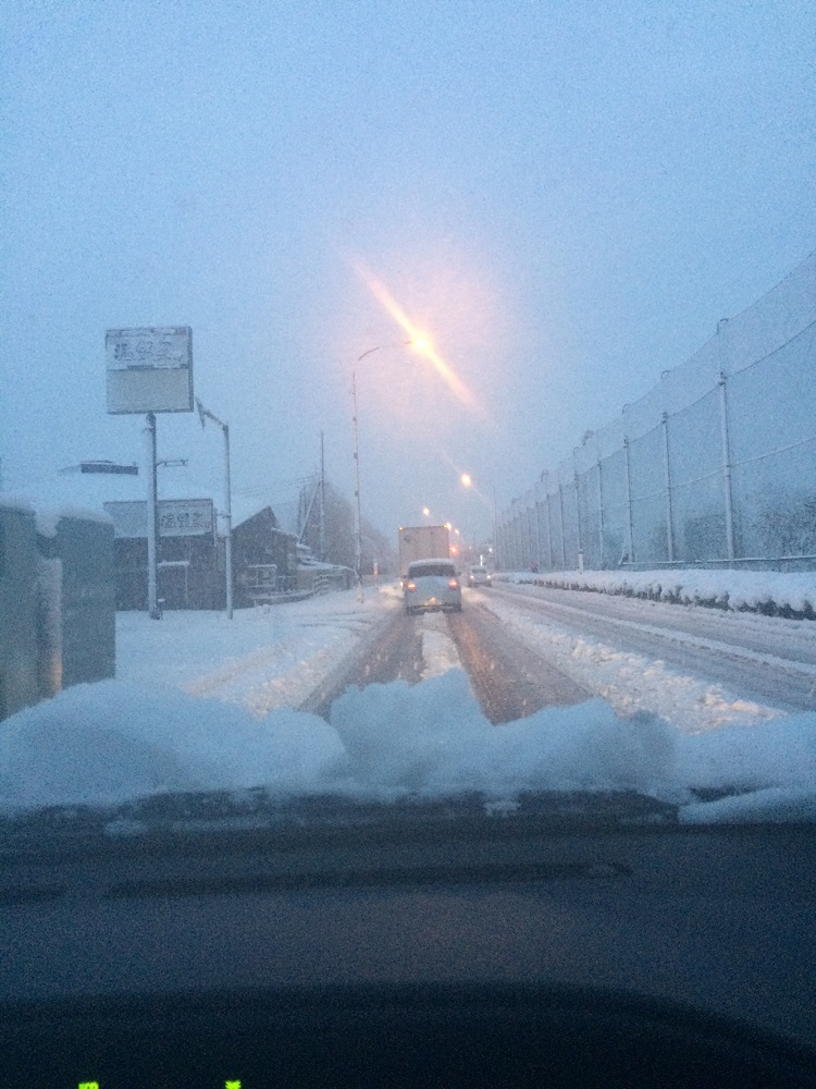 家をでてから会社まで約3時間程かかりました。途中、車の屋根の雪がフロントガラスに落ちてきて、視界0の時は怖かったです。