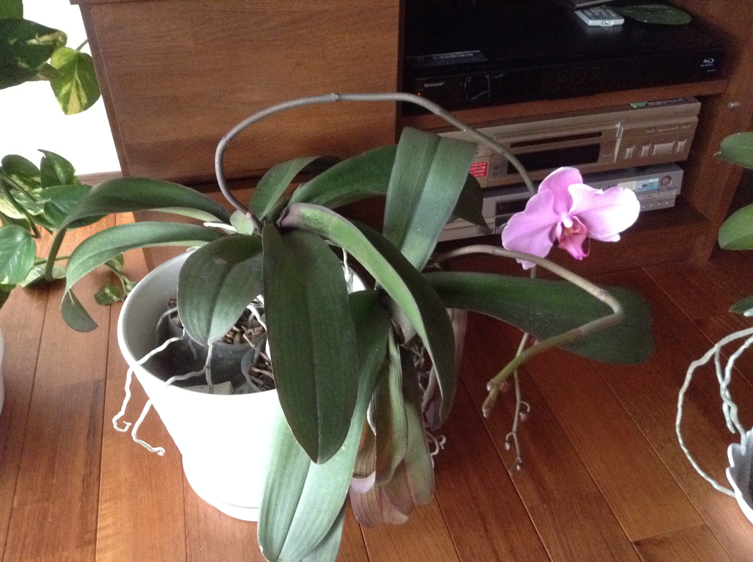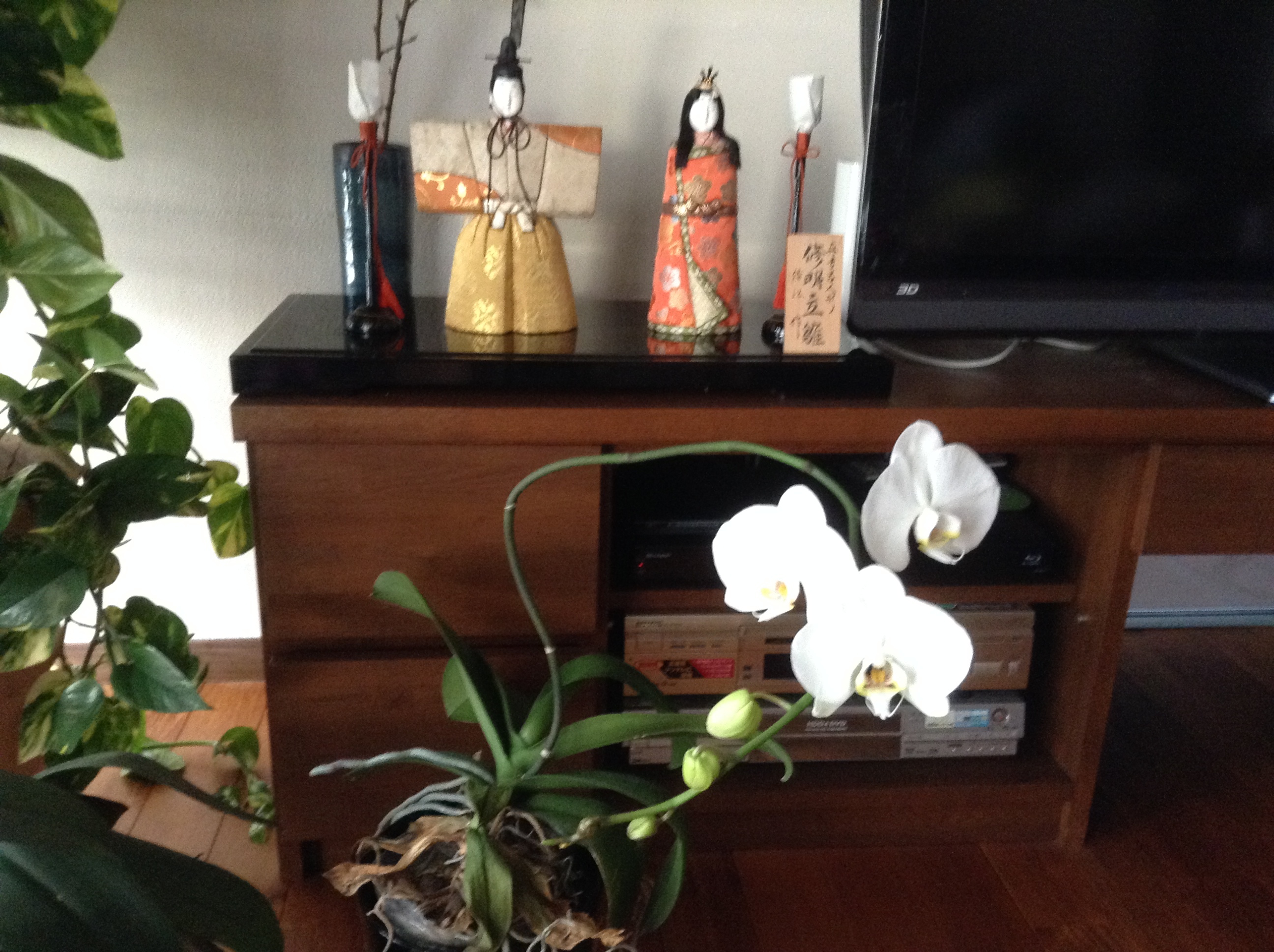 毎年この2月上旬に、新築祝いに頂いた白色と朱色のコチョウランが