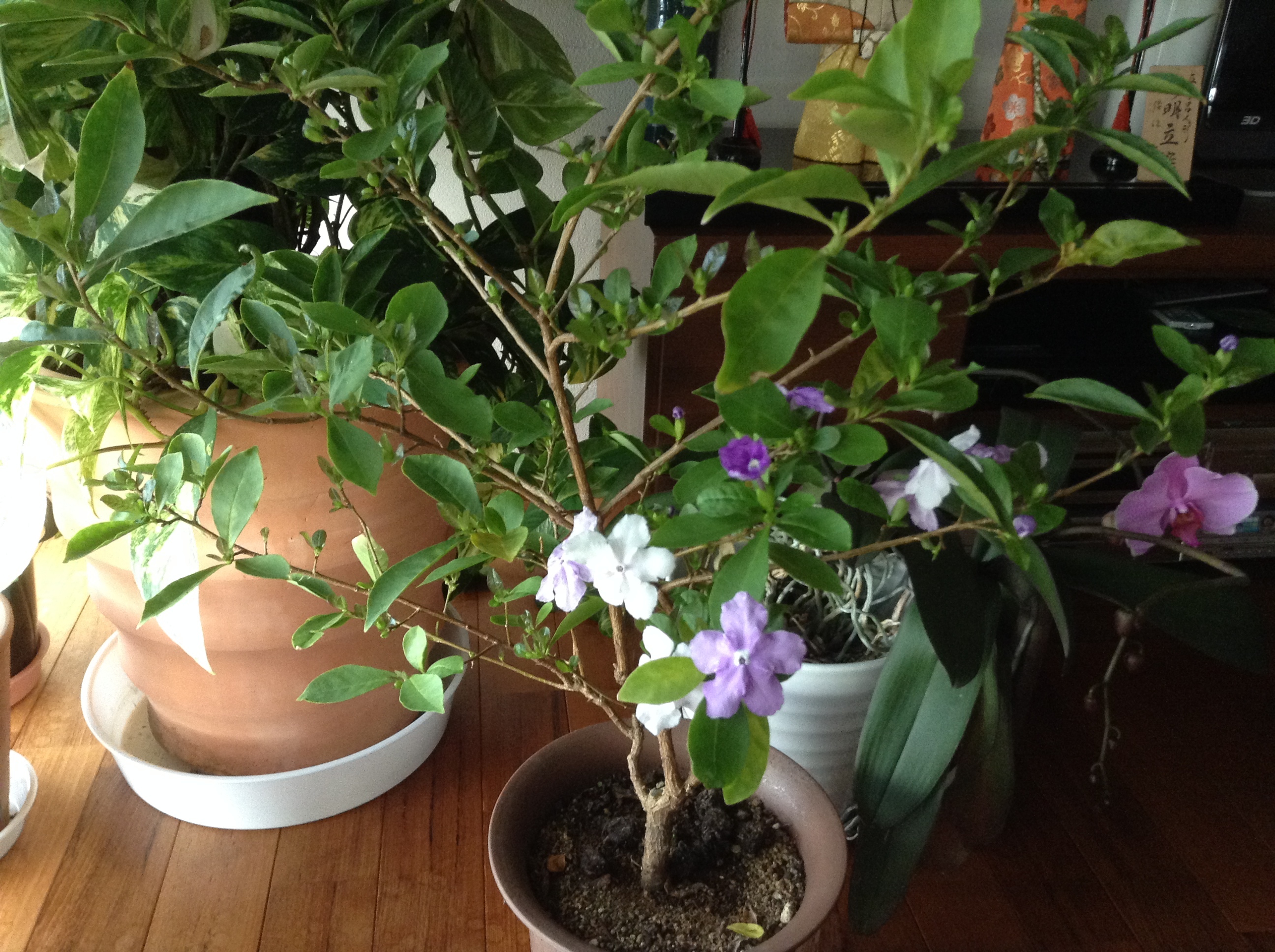 ニホンバンマツリ:ナス科の常緑樹 花は咲き始めが濃い紫色で、次に薄い紫色、最後は白色になります。