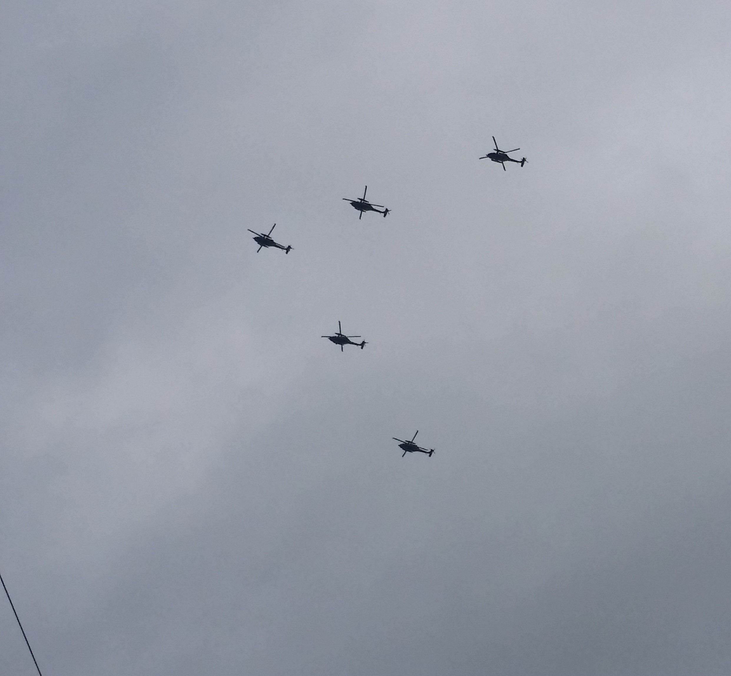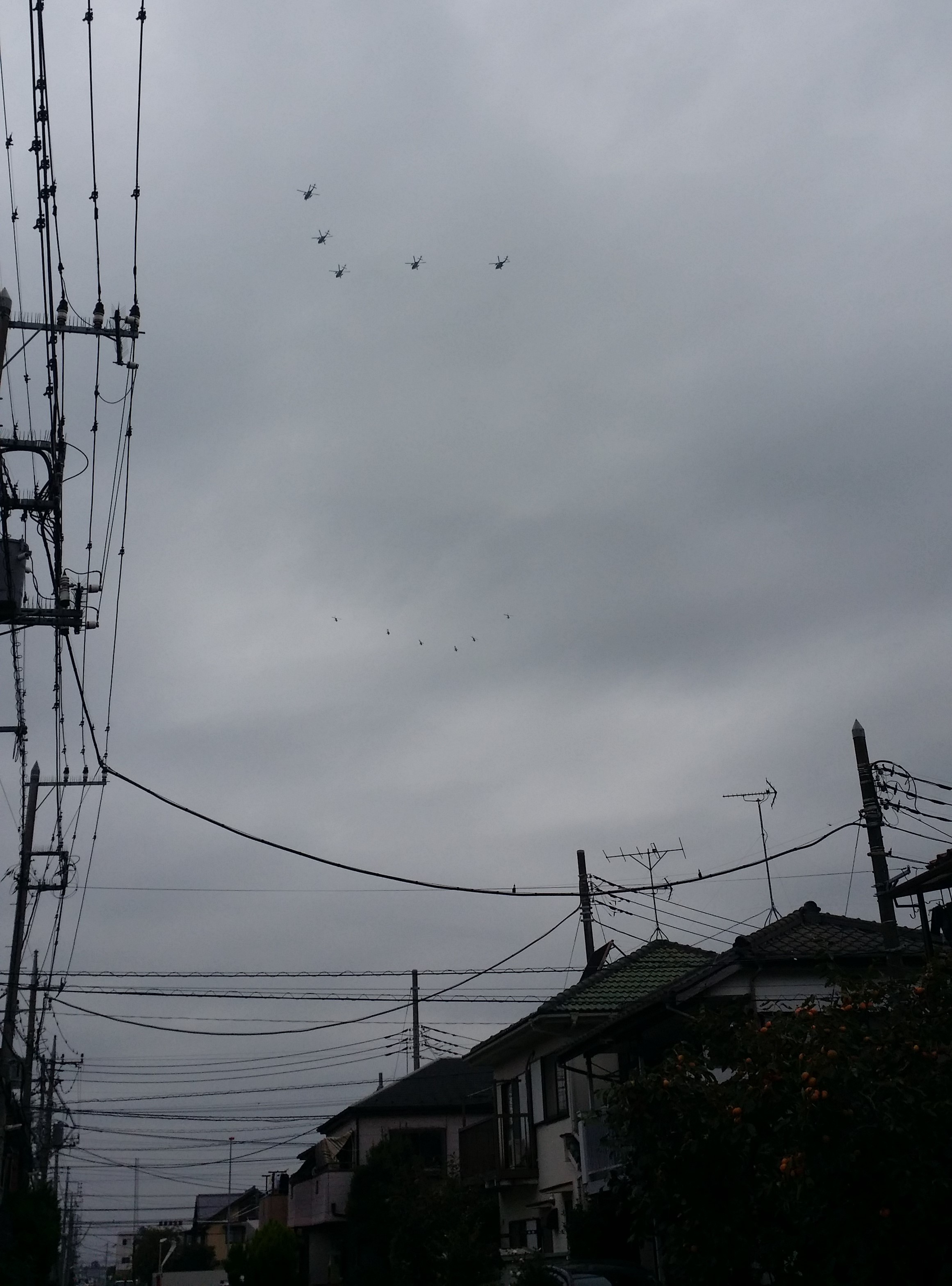 急いで外に出て、その方角を見てみると、編隊を組んだヘリコプターが飛んできました。