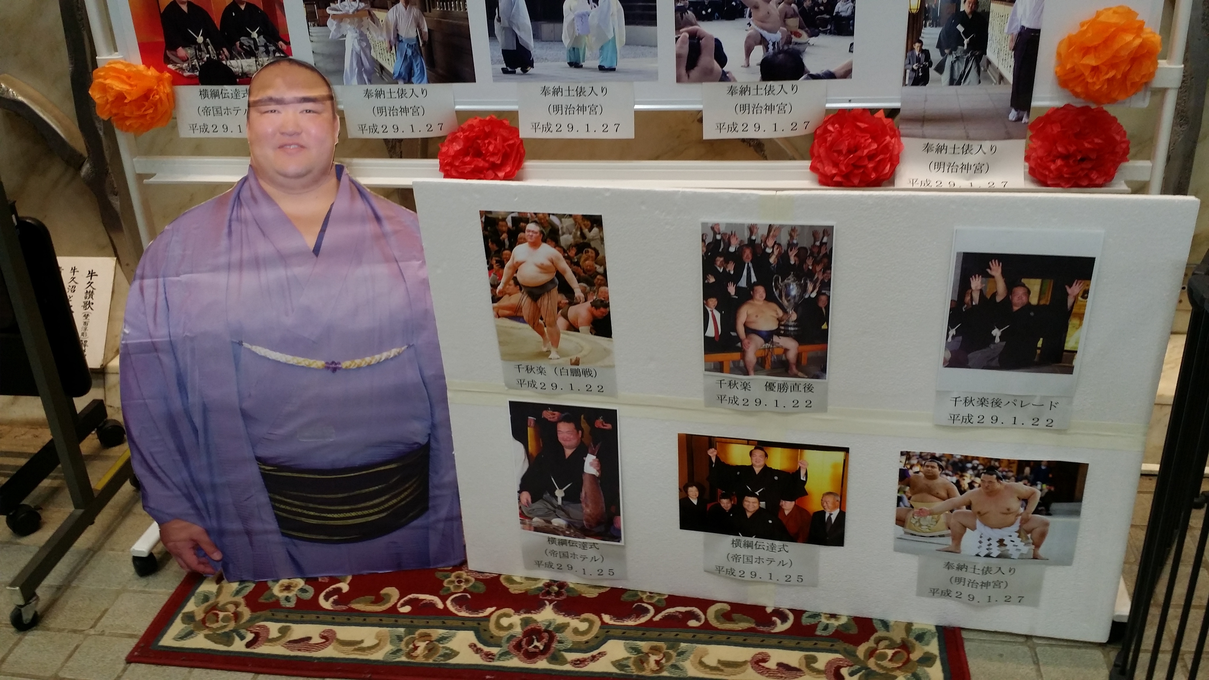 写真の様に、「稀勢の里」の優勝と横綱昇進を祝う横断幕や垂幕が飾られていました。
