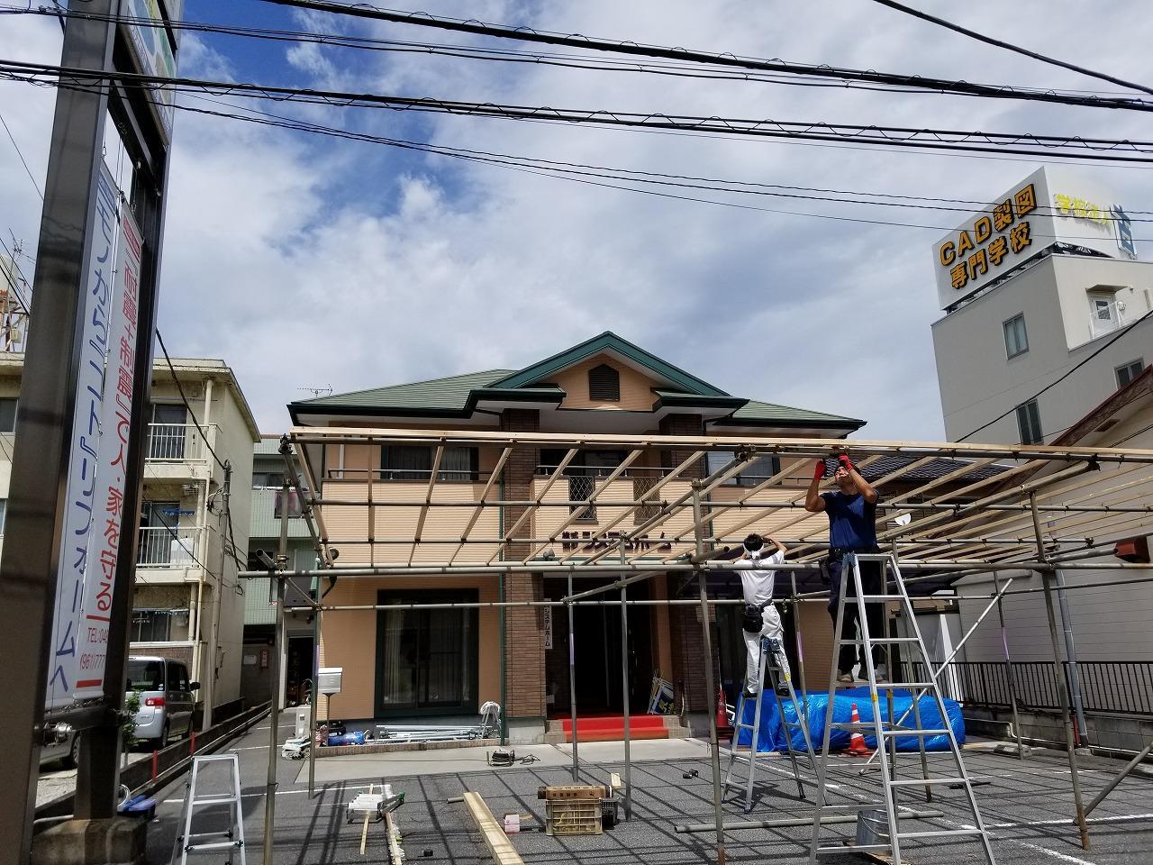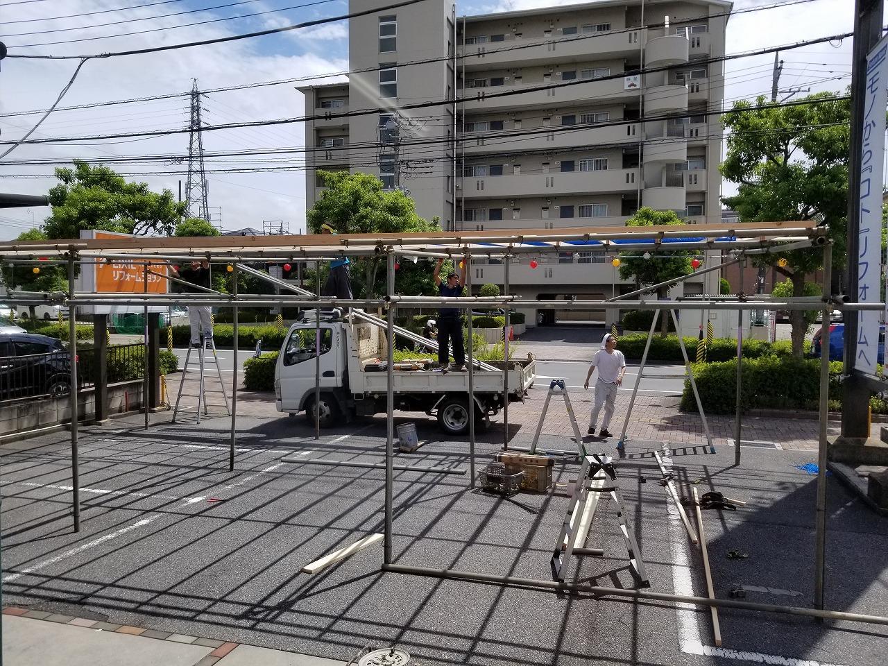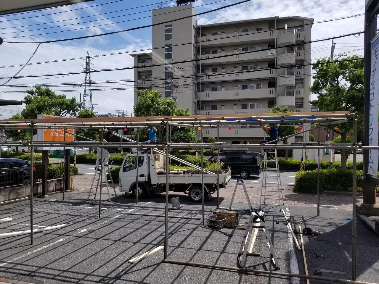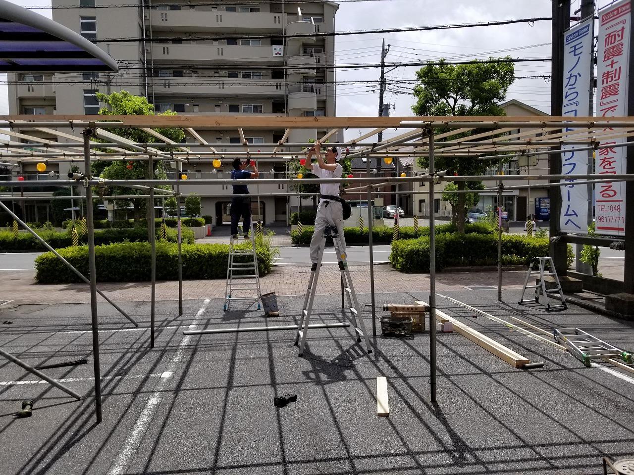 まず、①足場を組んでいきます。次に②屋根部分を造っていきます。