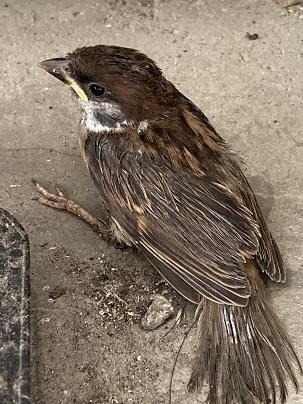 先日、会社の玄関わきにある傘立ての後ろに雀の子が隠れていました。