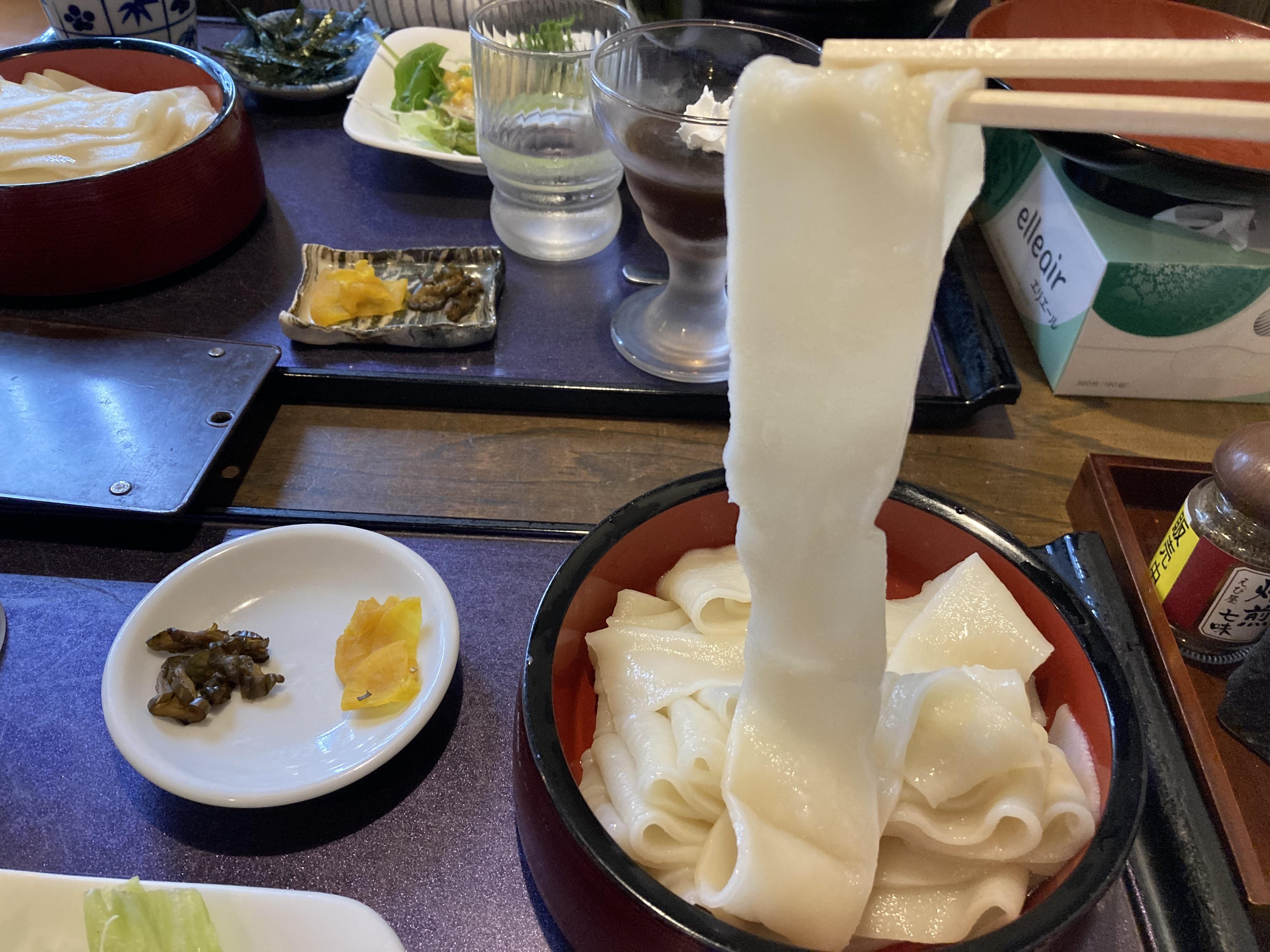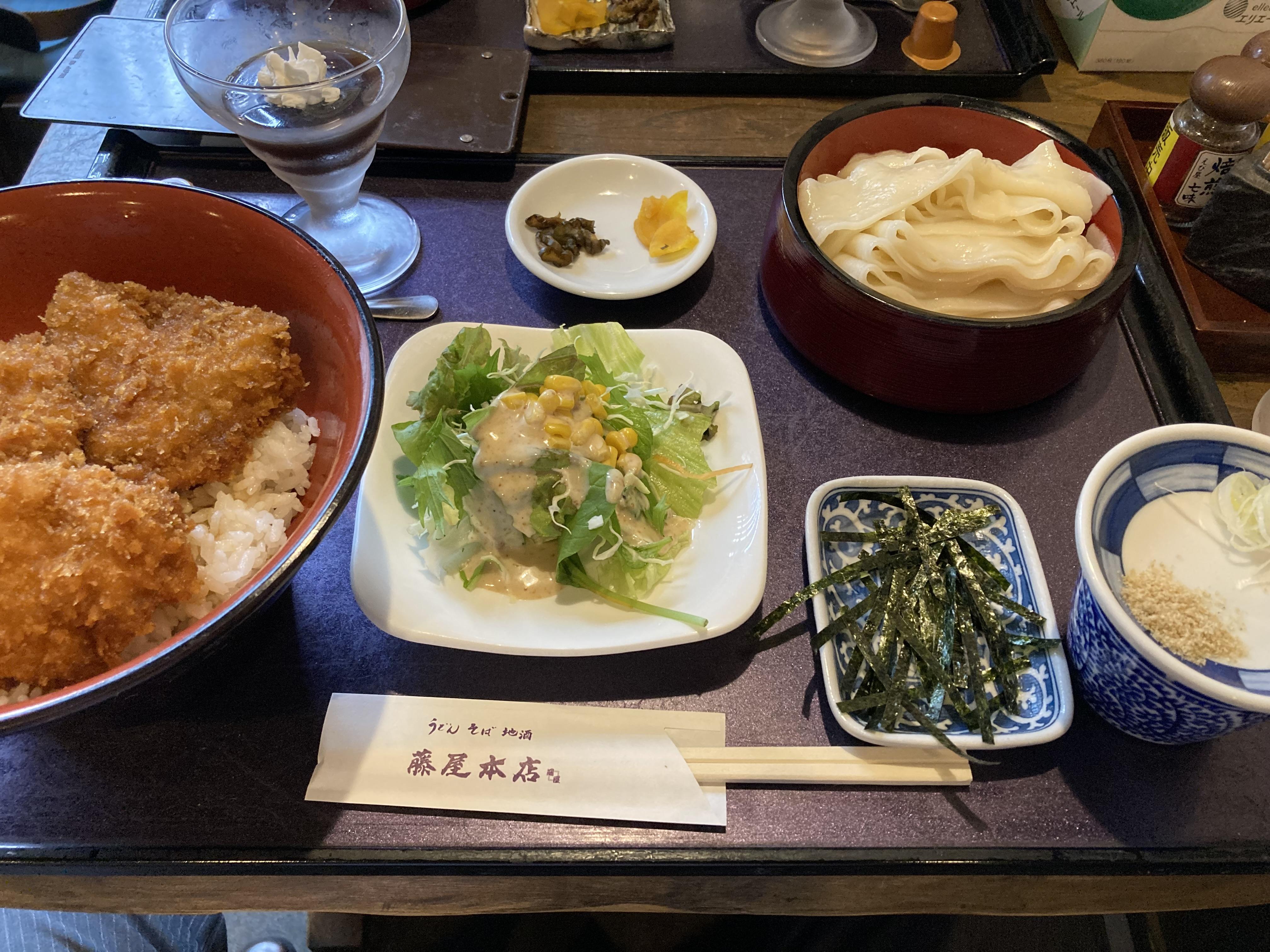 食事は、桐生名物ソースカツ丼とひもかわうどんのセットを頼みましたが、出てきた「ひもかわうどん」は、モチモチした食感で大変美味しかったです。(BYB)