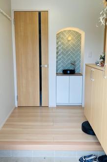 【LIXILメンバーズコンテスト2024受賞】くすみグリーンとブラケットライトの玄関手洗い