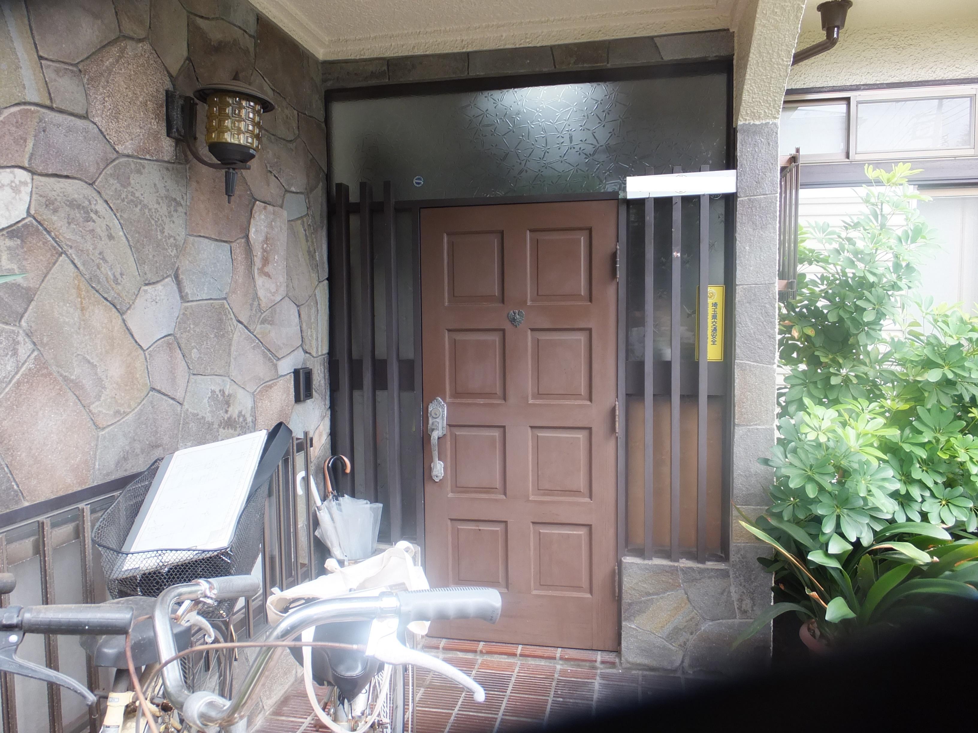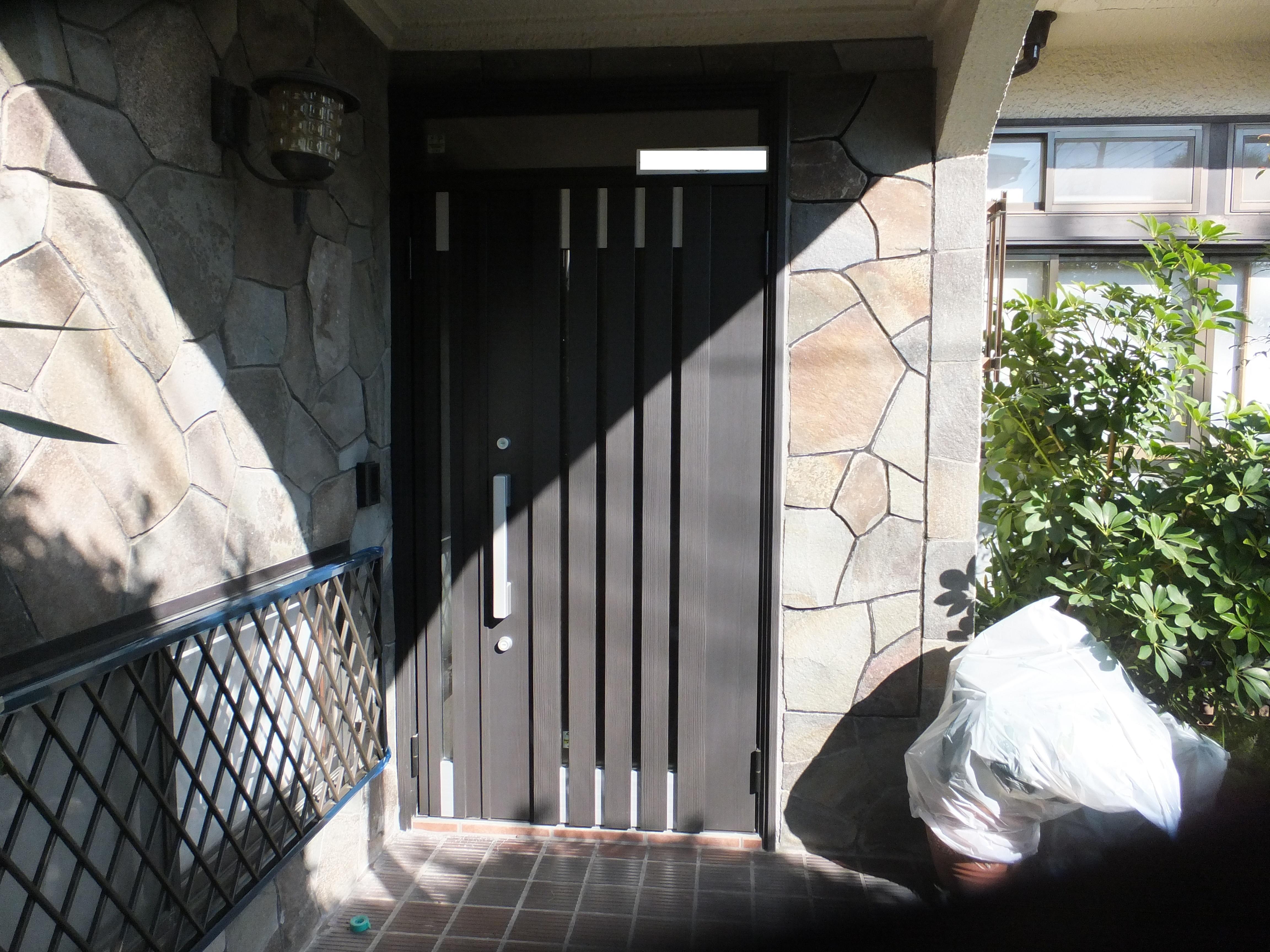 木製玄関ドアのメンテナンスが大変とのことで、防犯性が髙く、アルミ形材に断熱材が入った仕様のドアに取替えました。以前両袖ガラスだったのを、今回は片袖は鉄平石の壁にしています。