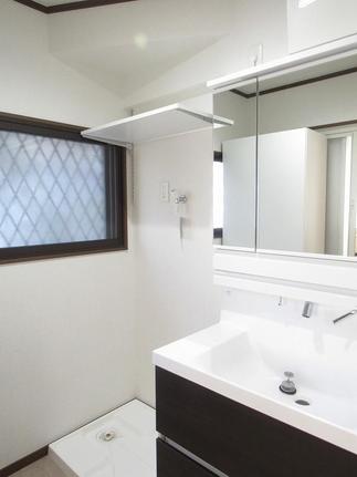 洗面脱衣室のサイズは変えずに、洗面台、洗濯機、整理棚の位置を見直し使い勝手を検討しました。以前窓側にあった洗面台を入口付近に変更、洗濯機の反対側の壁に整理収納を造作しています。