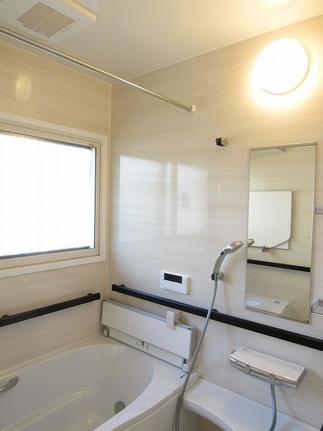 LIXILが提案するユニバーサルデザインの一つ、誰でも気軽に入浴できる「サポートパック」をオプションで採用しています。お風呂に入る一連の動作が途中で途切れることなくスムーズに行える工夫があります。ex 四方手すり、シャワーホースは隅に、腰かけて入浴するための風呂ふた