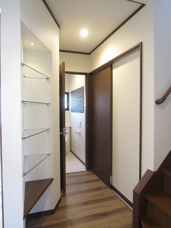 節目の大切な家族写真をたくさん飾られていたM様。斜めにカットされた角の壁を生かし、ガラス棚の飾り棚を設けました。