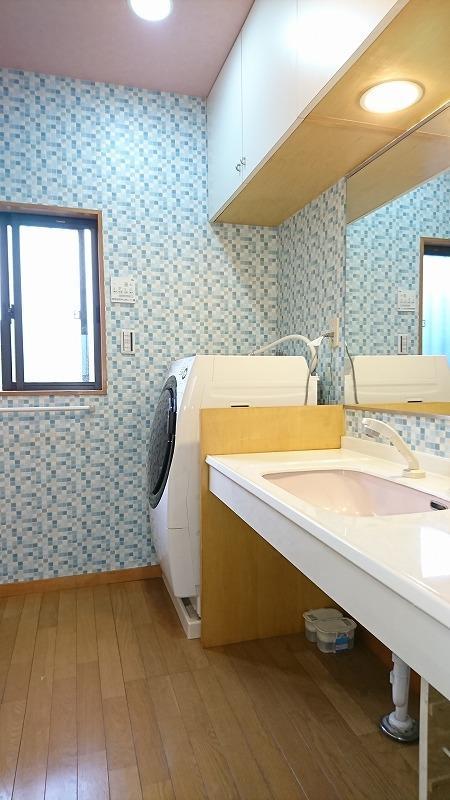 浴室の水洗金具の不具合もあり、この機会に最新設備の浴室に替えたいとご相談ありました。隣室の洗面脱衣室も、浴室工事に伴い張り替えが必要な壁面以外についてもクロスを張り替え、ポップな明るい空間になりました。