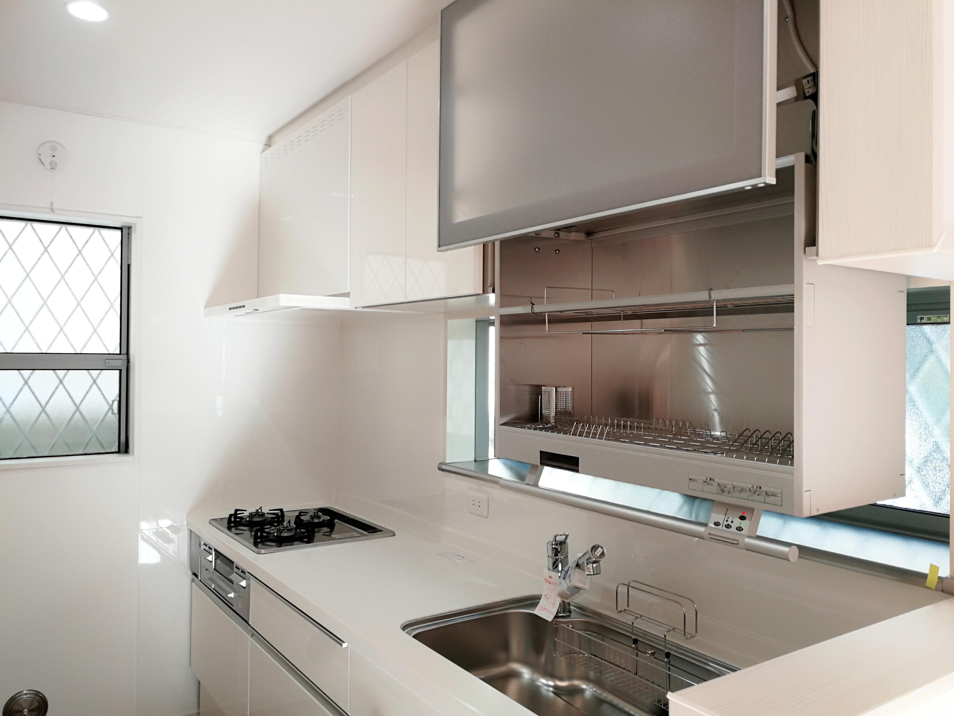 広く使い心地の良いLIXILのキッチン。特にシンクの広さは実際に見てみると、その大きさに驚かされます。また、今回の工事担当者の提案により、ウォールユニットに食器乾燥庫をつけました。電動で降りてくる為、力いらず。洗った食器をそのまま収納すれば、自動で乾燥してくれる優れものです。食洗機を使うほどの食器はないけど、乾燥機は欲しい!という方に大人気。お客様もご満足の様子でした。