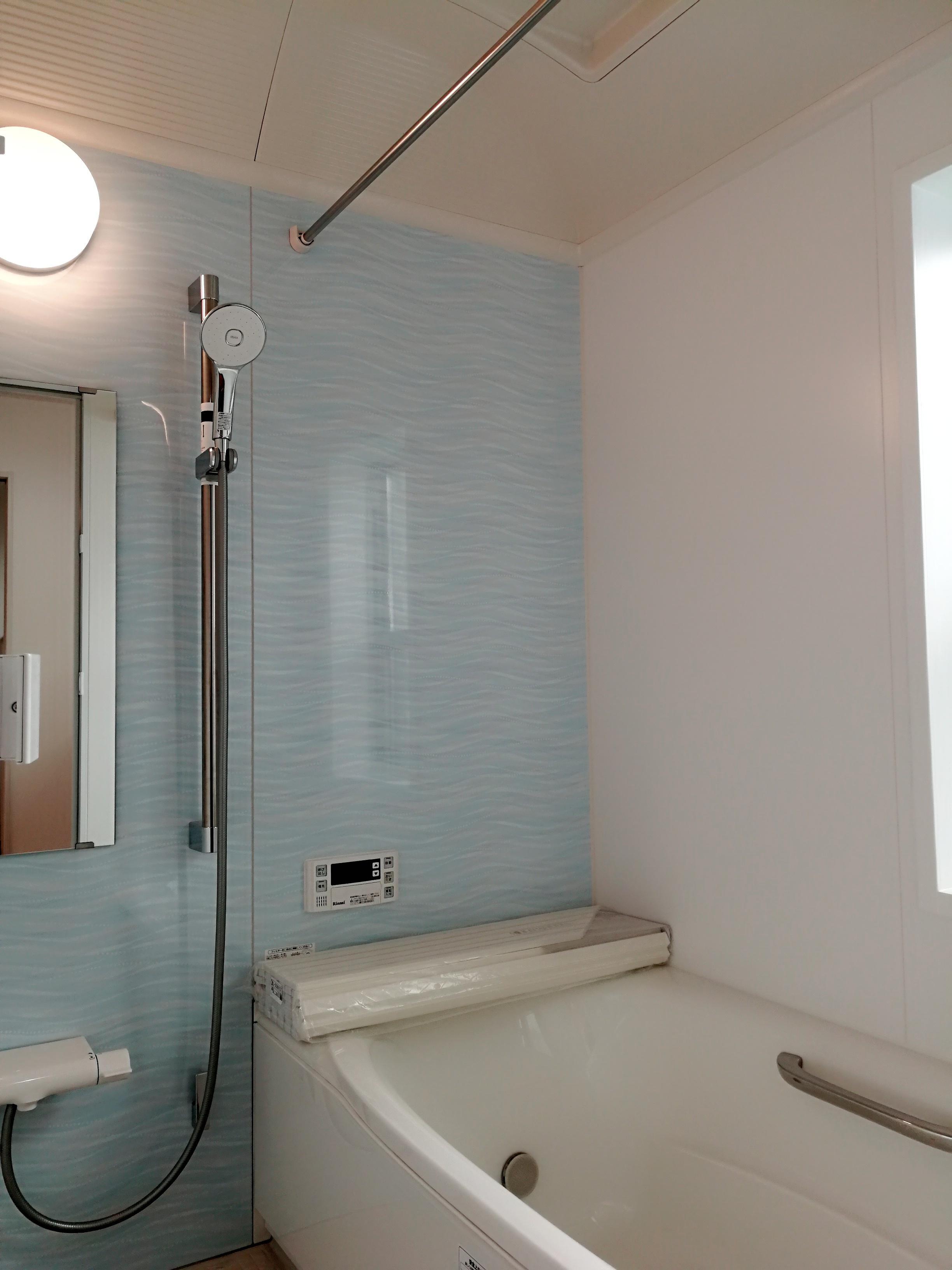 LIXILのユニットバスで一番人気の『アライズ』を選択していただきました。ブルーのパネルが浴室全体の清潔感を演出しています。ひろびろとした浴槽で、日々の疲れを癒せます。