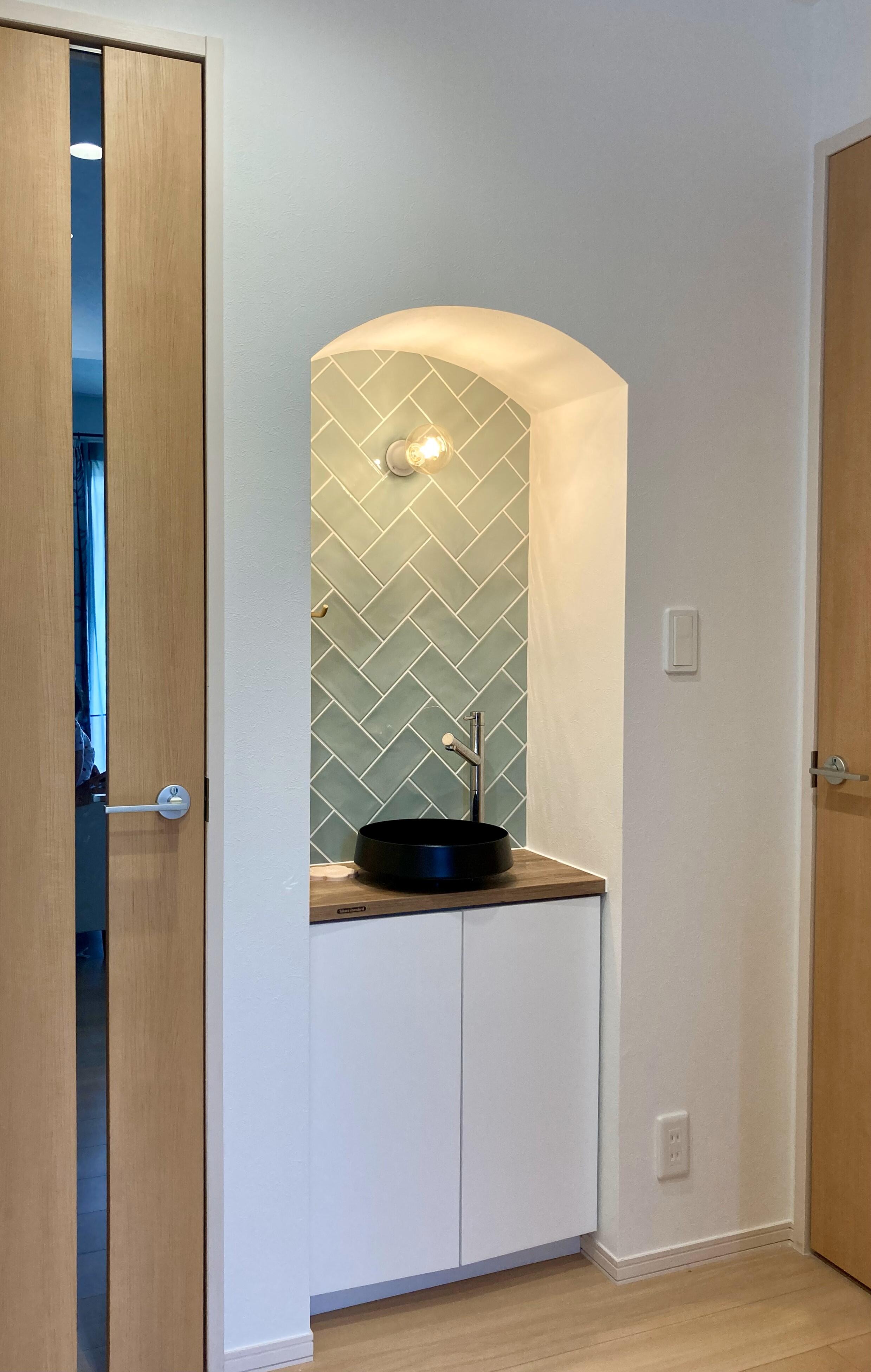 家の雰囲気は自然な風合いを生かしたナチュラルな木目調なので、「雰囲気を壊さないお洒落な手洗い」が実現しました。 『トイレの後や外出後、来客時も気にせず、手を洗いたいと思った時に手を洗えるようになって、嬉しいです』
