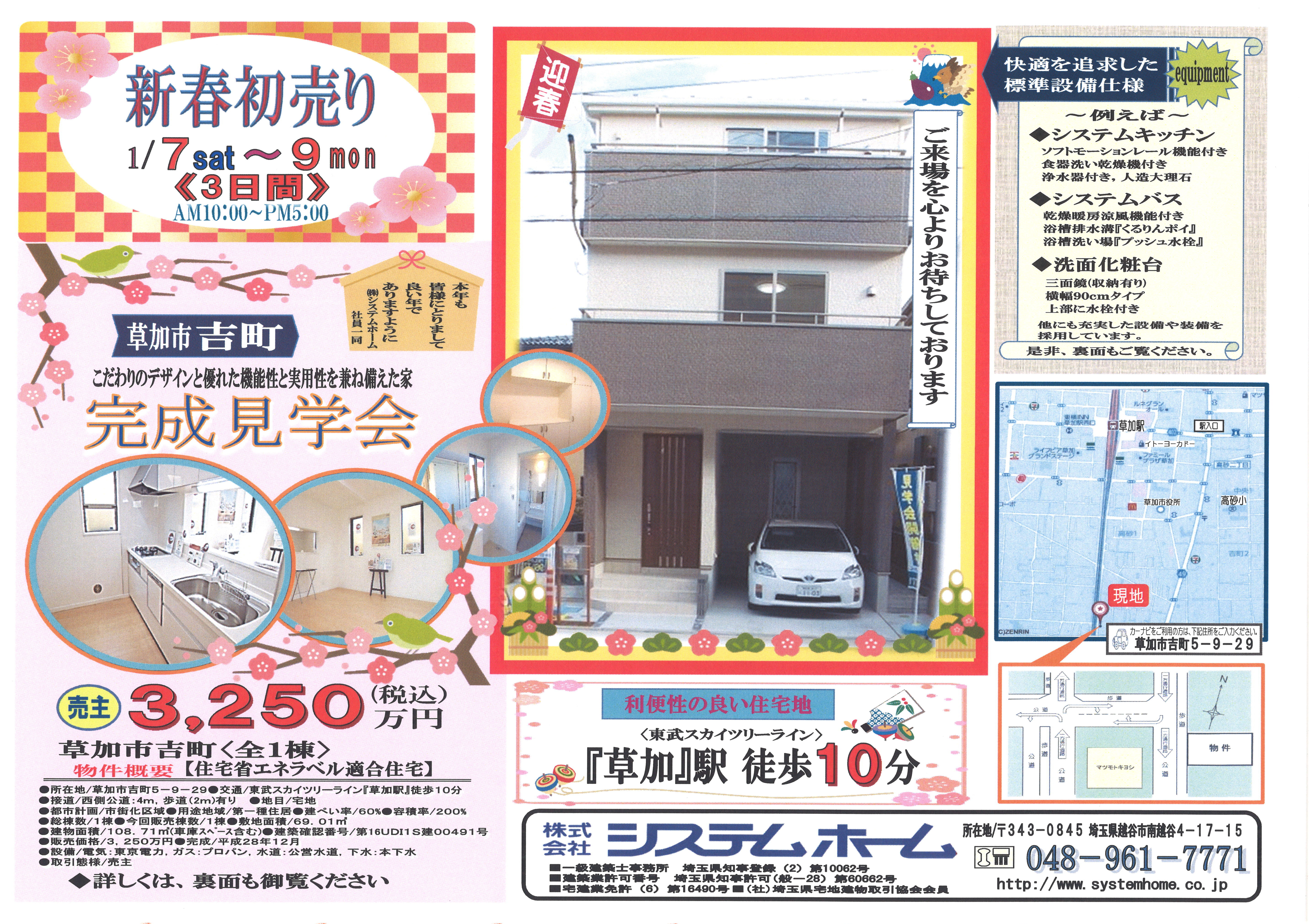 2017年の1月7日(土)から9日(月)まで、当社で建てた【新築一戸建て】の完成見学会を催します。