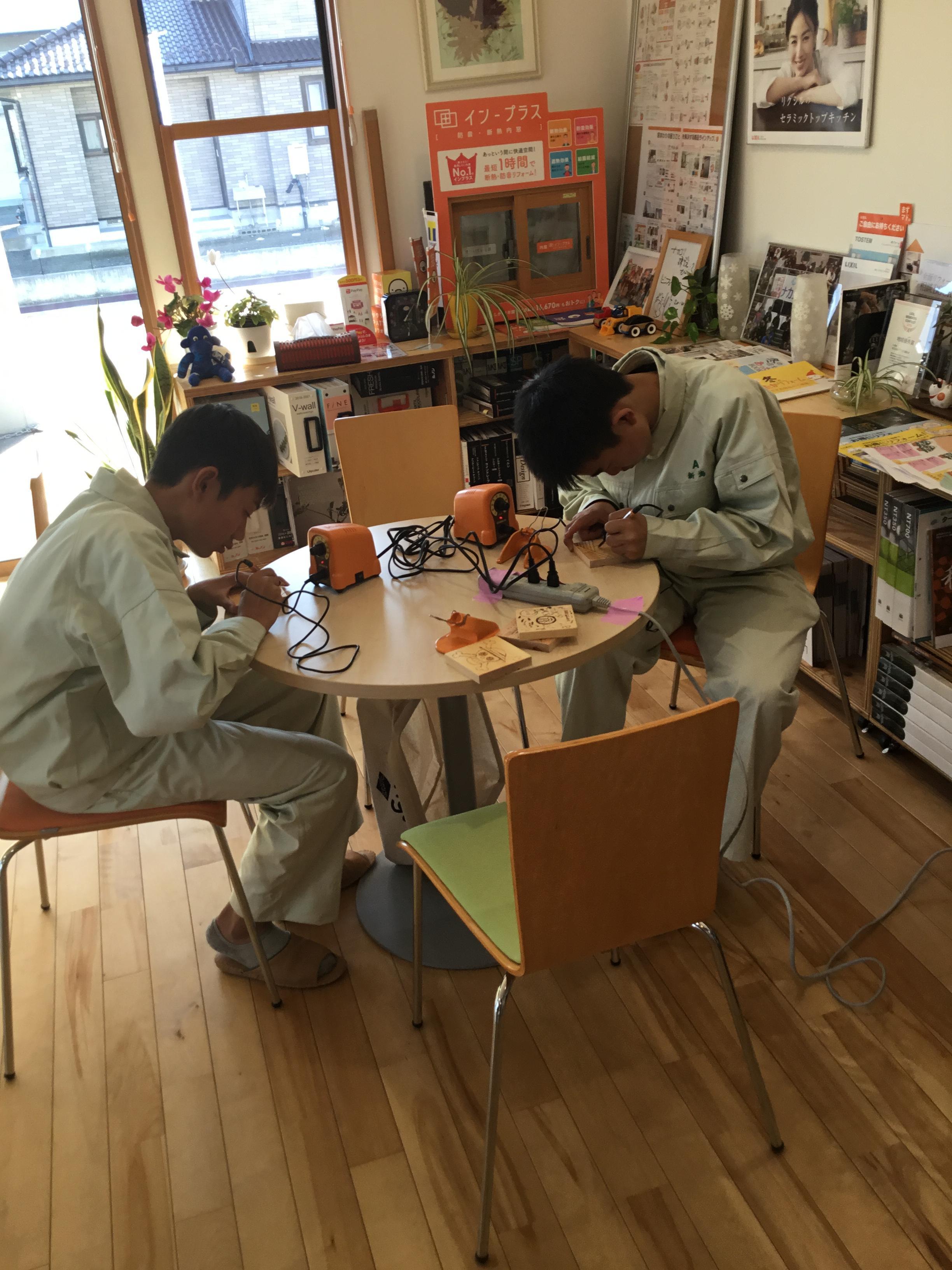 これは熱ペンで木のコースターに絵や文字を書いているところです。