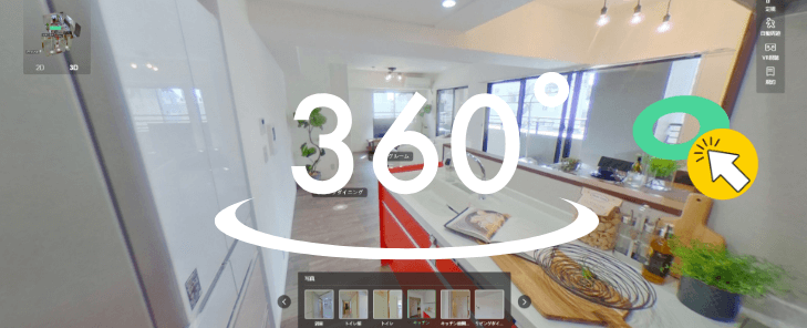 「VR 施工例」は、AI技術による画像処理により、建物内部をリアルにご視聴いただけます。その場にいるような感覚でリフォーム物件をご欄いただけますのでぜひご体感ください。