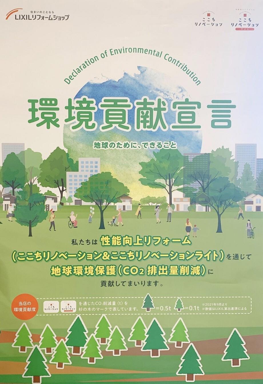 LIXILリフォームショップで、実施している『環境貢献宣言』に私たちは性能向上リフォームを通じてCO2排出量削減に貢献しております。