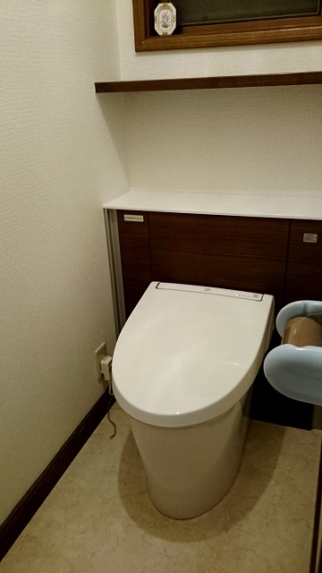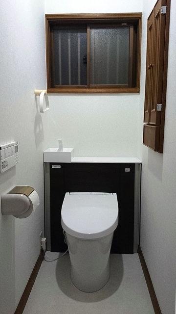 以前より弊社にご愛顧頂いているお客様宅のトイレリフォームです。 今までに比べトイレ空間がとてもすっきりしたイメージになりました。 この商品は、デザインもステキですが、お掃除らくらくなんです。 背面キャビネットが一体になっておりますので使いやすくてたっぷり収納、さらにカウンターになっておりますのでオシャレです。 その他、トイレ内装仕上げ(床、壁)の変更を同時にさせて頂きました。 お客様の日常生活に支障ないよう1日ですべて完工させて頂きました。 給排水管の接続復旧後に各部の最終点検確認を行いいずれも問題なく、お客様にお引渡しをさせて頂きました。