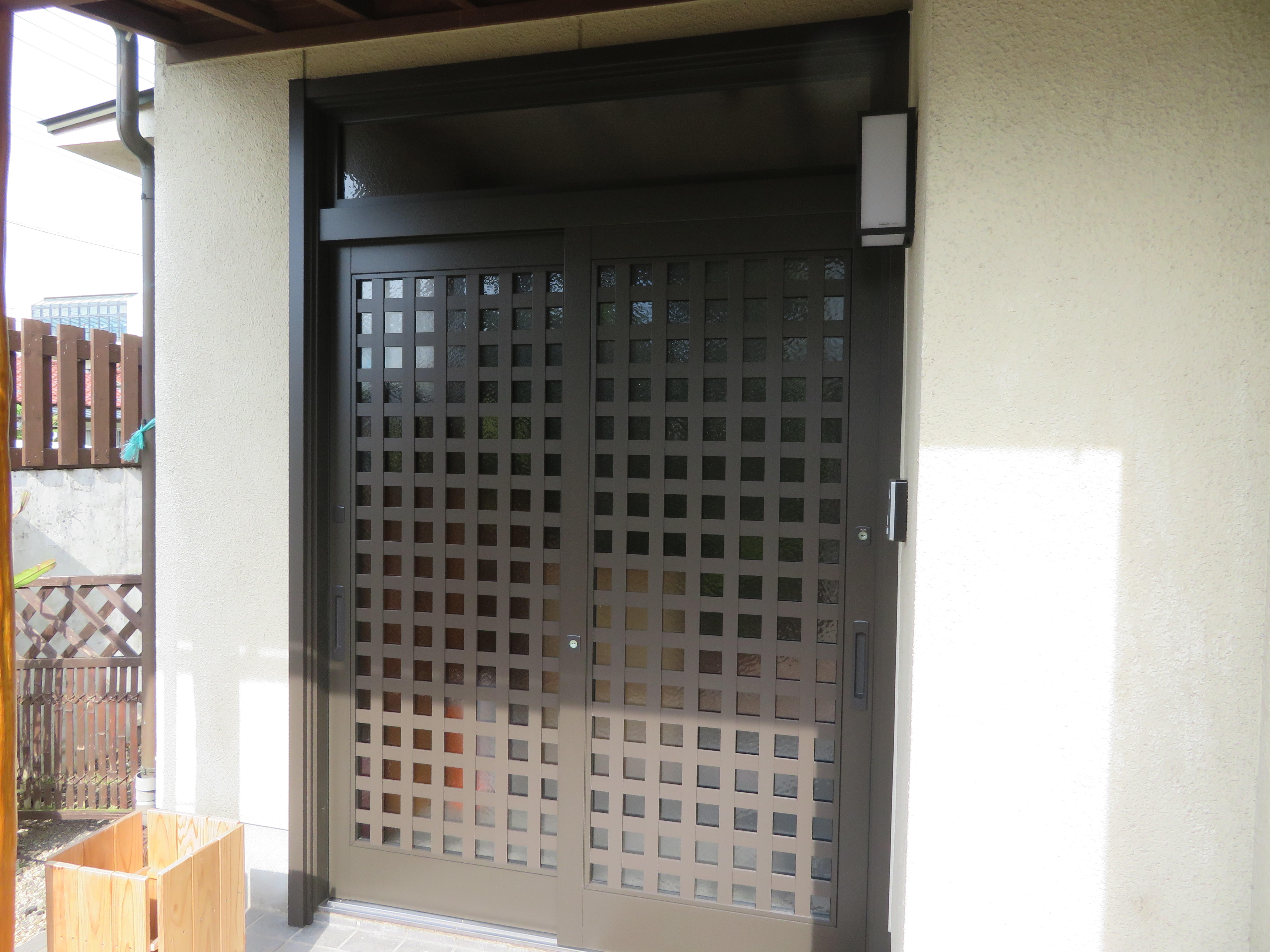 玄関引戸のリフォームを行いました!こちらの引き戸は1日施工でできます。室外内側からの防犯対策もされている玄関引戸です。 色をオータムブラウンにしたらとても温かみのある玄関になりました。