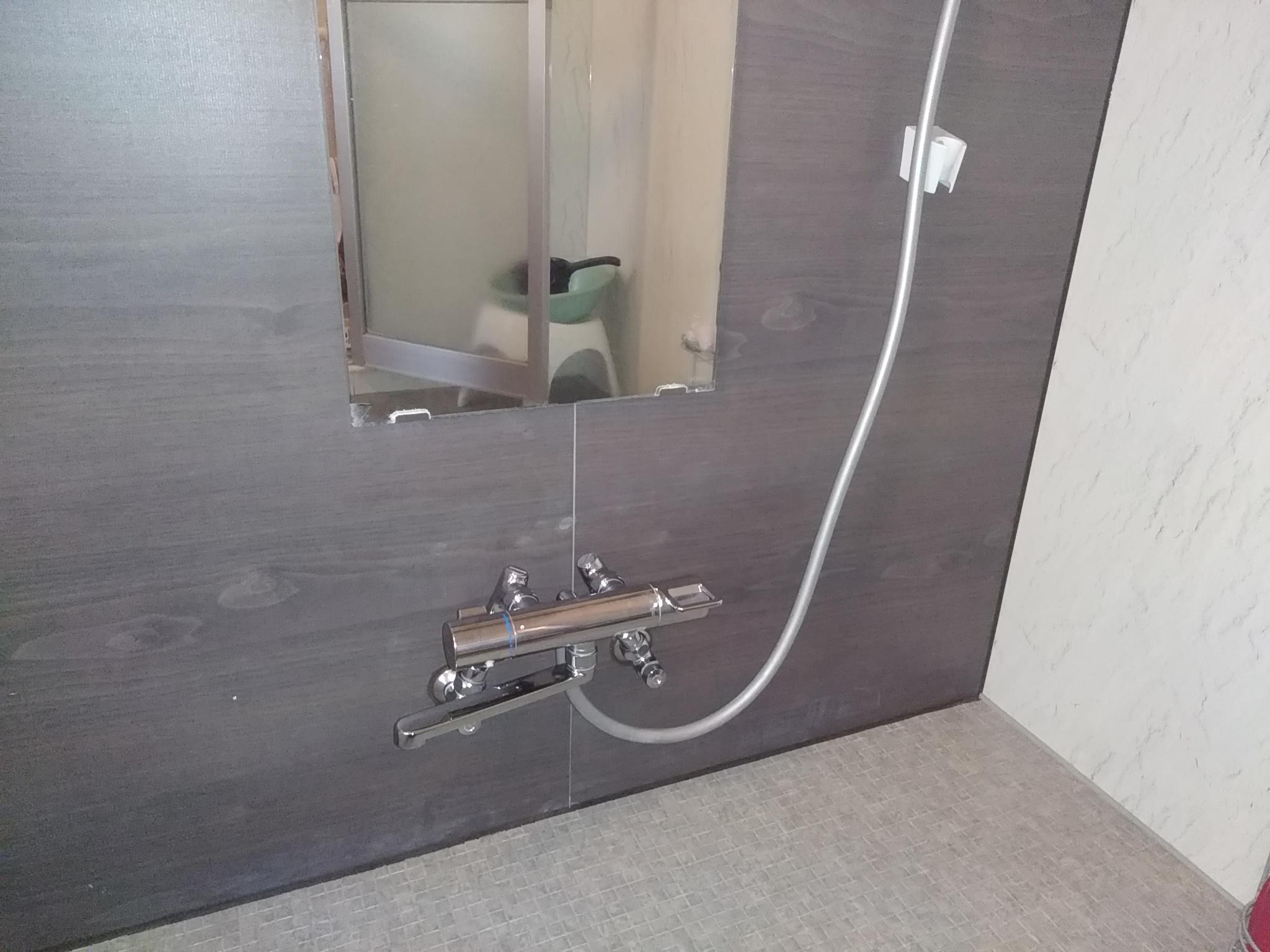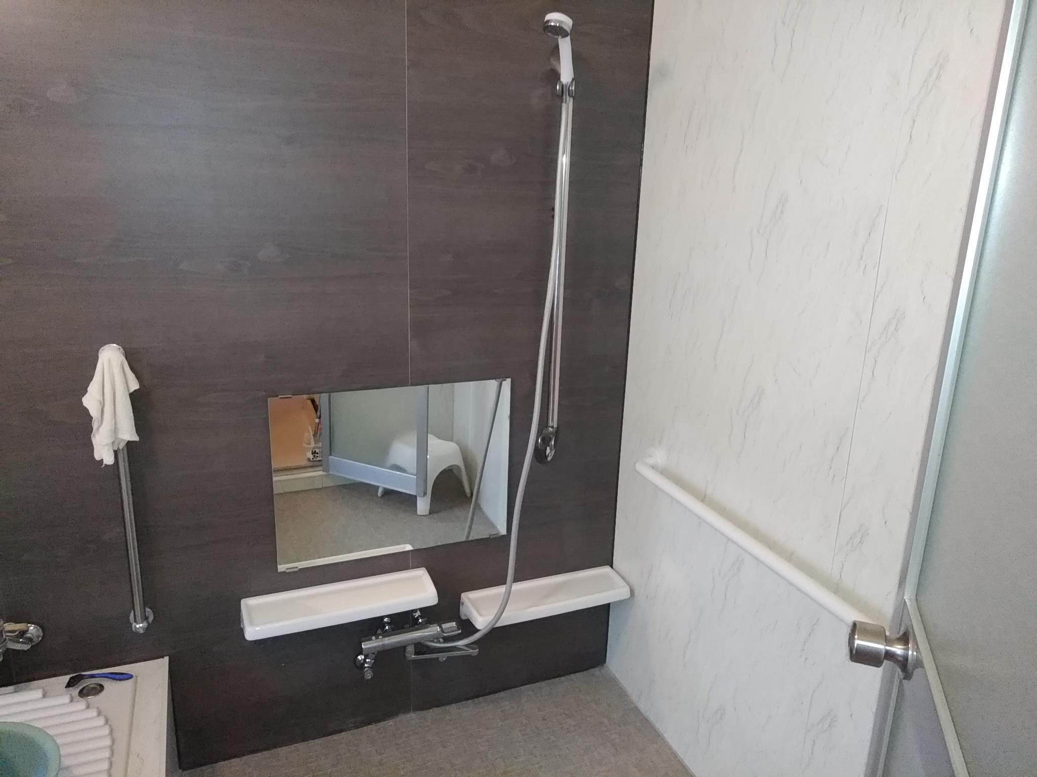 お風呂の洗い場をリフォームしました。 座った状態で使用できるように、シャワー用スライドバー・手すりを取付ました。 シャンプーなどを置けるカウンターも新たに取付、鏡も交換しました。