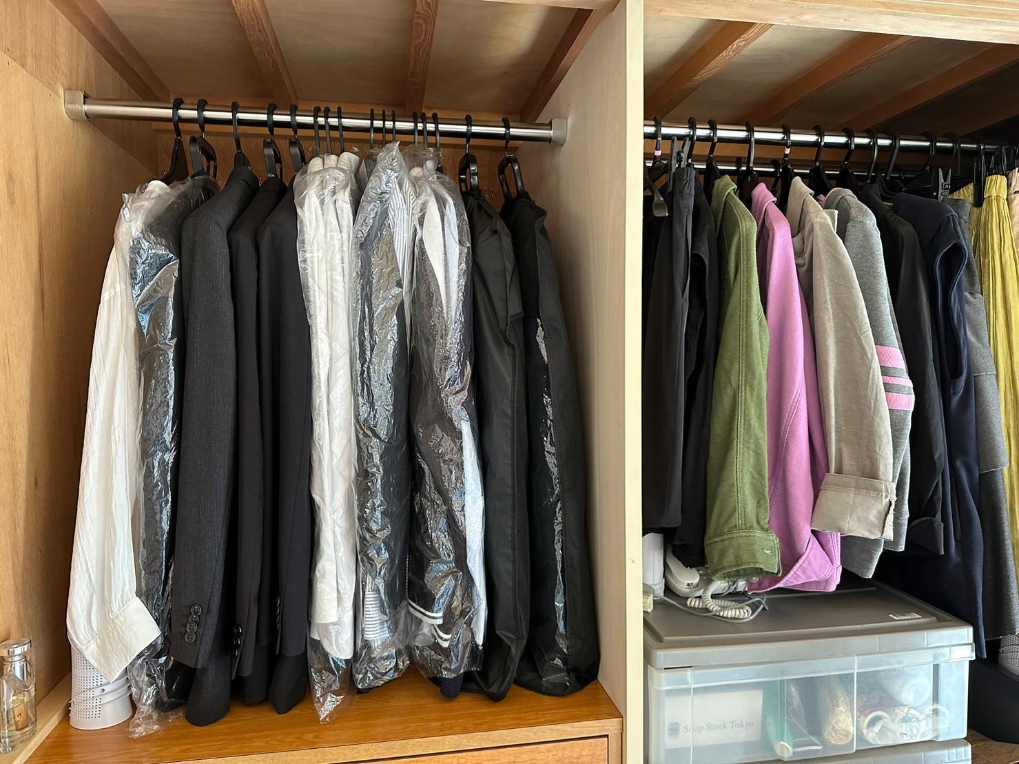 押入れのままだとどうしても出来てしまうデッドスペースを無くしました。 押入れの中段を外し、洋服をかけられるようにハンガーパイプを設置。 ハンガーパイプを2つ付けることで、奥行きも無駄にせず収納が2倍になります。
