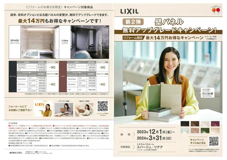 第1弾でも大好評だったキャンペーン‼2023年12月1日㈮~2024年3月31日㈰まで、システムバスルーム【スパージュ】【リデア】にてリフォームをしてくださった方に通常では有料オプションとなっている壁パネルの変更が、無料でアップグレードできます。最大14万円もお得なキャンペーンです。