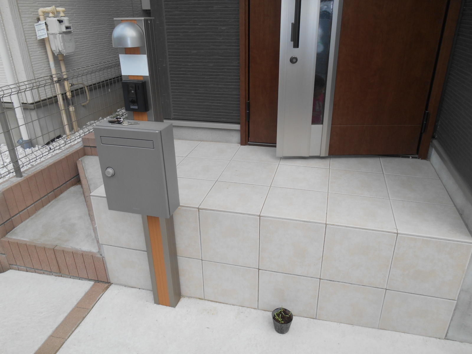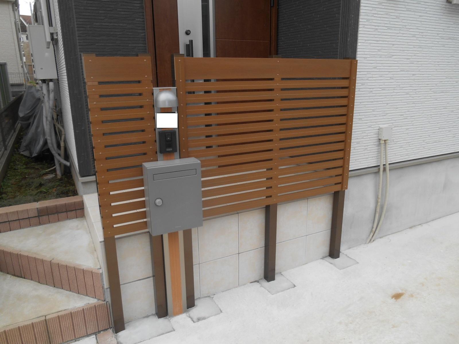 玄関ポーチからの転落防止と、玄関の目隠しをしたいとのご依頼をいただきました。 既存のインターフォンとポスト、玄関ドアの色にあわせた木目調の目隠しフェンスをご提案させていただきました。 こちらは耐候性に優れ、メンテナンスフリーとなっています。