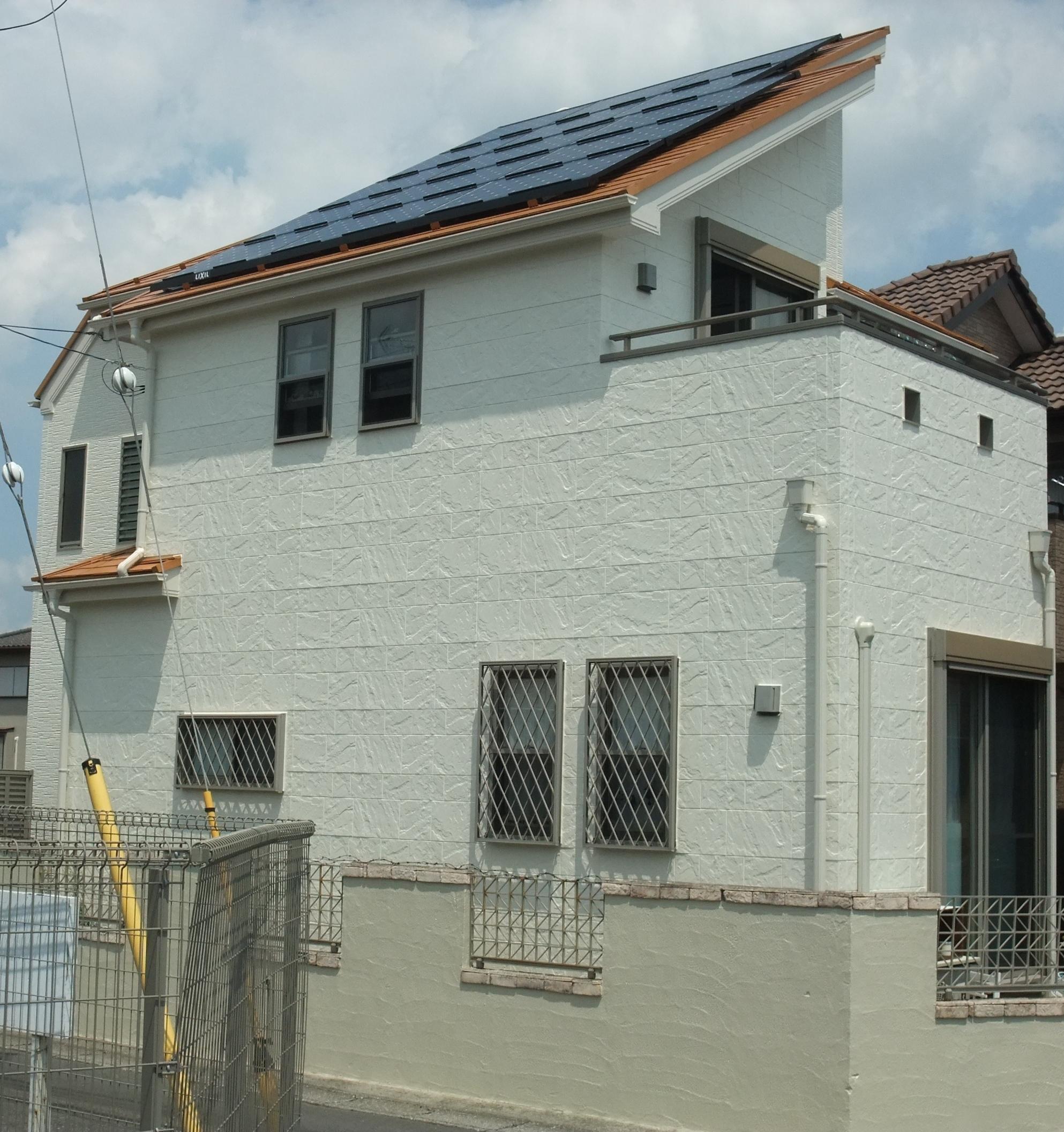 外壁診断の結果、塗膜の劣化やひび割れが見られました。 太陽光パネルの設置もご依頼いただいておりましたので、屋根・外壁塗装とご提案させていただき、まるで新築のような外観に変身しました。