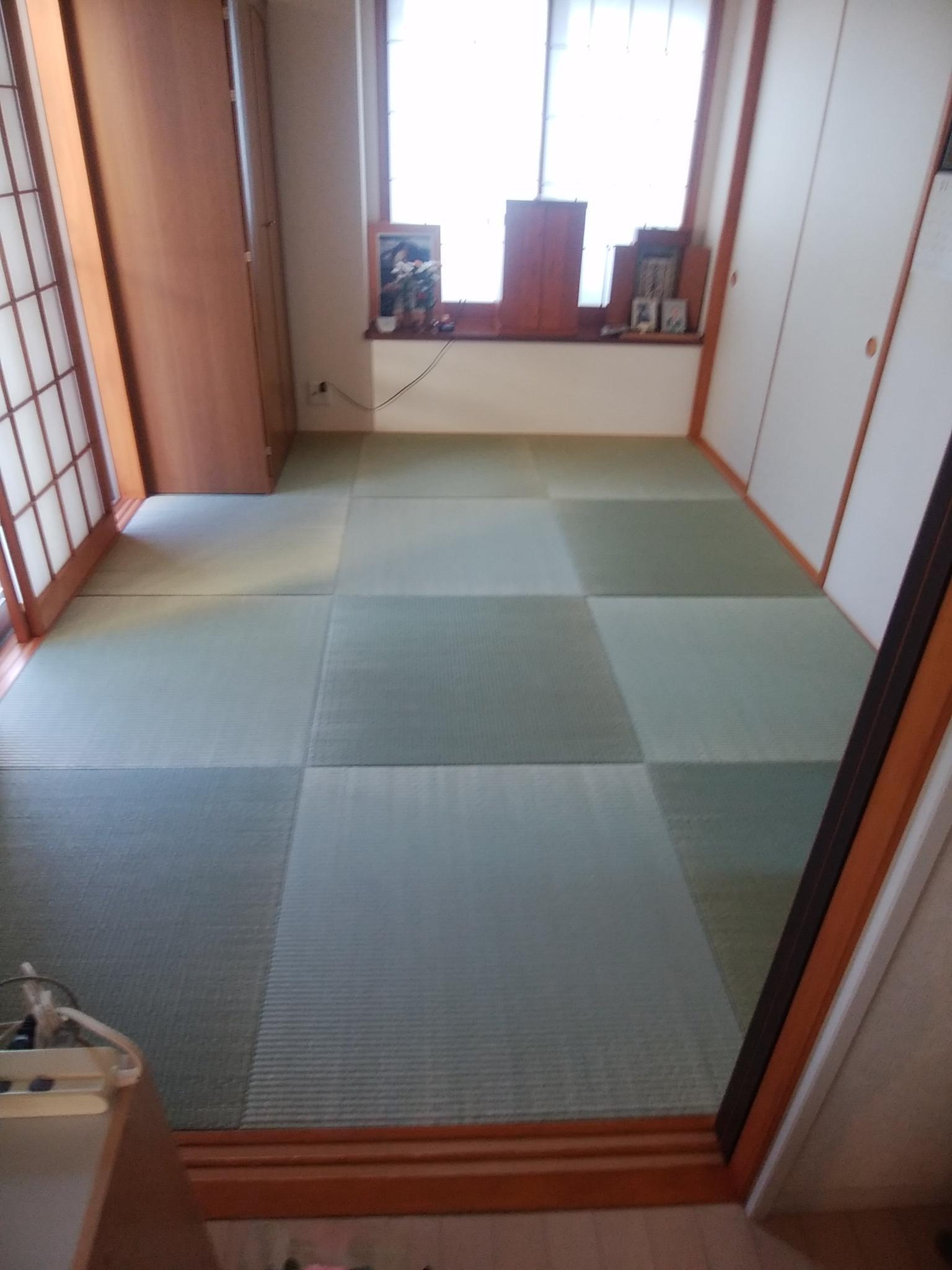 経年劣化による色褪せと傷みのある畳。 和モダンな印象になるよう、四角い畳でご提案させていただきました。 濃淡が美しく、畳交換だけのリフォームですが、お部屋の印象はガラッと変身しました。