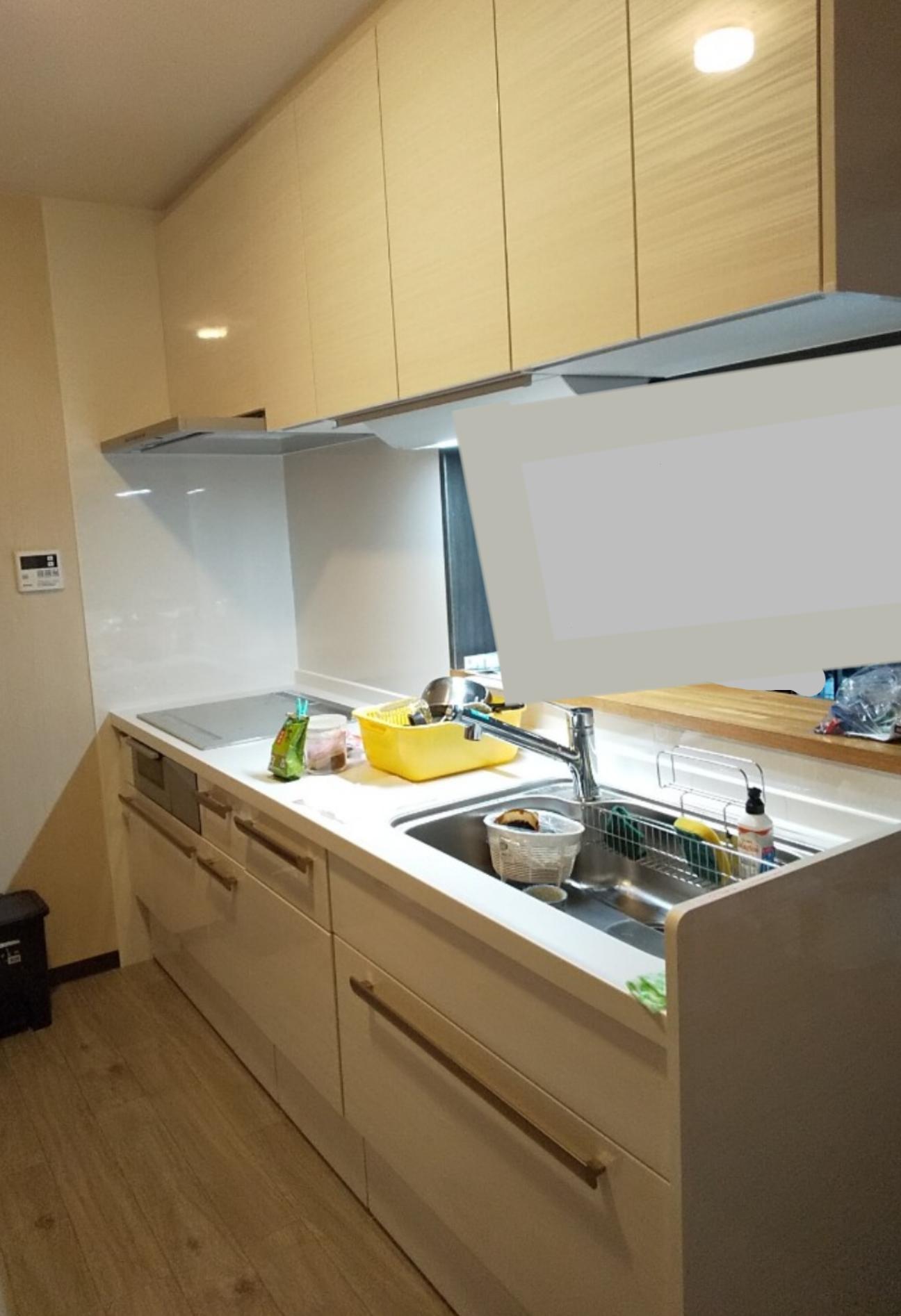 白を基調をした高級感のあるキッチンに仕上げました。 ガスコンロからIHへ切り替え、火元の廻りはタイルからキッチンパネルに貼り換えたことで、清掃性もUPしています。