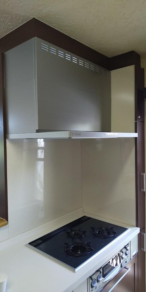 今回はレンジフードの交換をさせていただきました。 換気するための扇がコンパクトながらも吸引力が高くなり、また音も静かなので、動作中もご家族の会話を遮ることがありません。 面で受けるデザインなので、お掃除もパタンの蓋のように外すと、内部を楽々簡単に油汚れを拭き取ることができます。