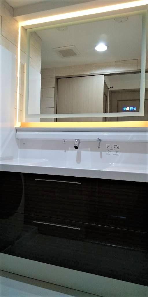 女優照明やサウンド機能のタッチパネル付きのホテルライクな洗面化粧台